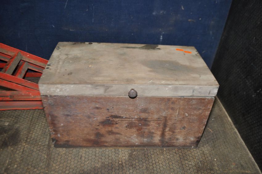 A PAIR OF CAR RAMPS, a pair of axle stands, a Lake and Elliott bottle jack (no handle) and a wooden toolbox containing spanners, and other automotive tools
