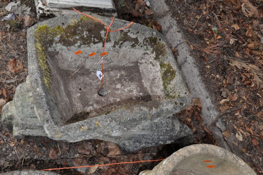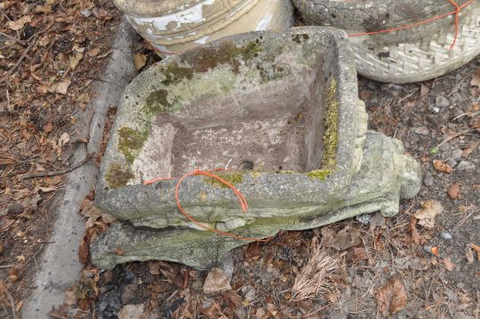A DUKE FOREST LIMITED CONCRETE WHEELBARROW PLANTER, with heavily detailed top on a separate base, total length 75cm. Condition Report: mossy but no obvious damage