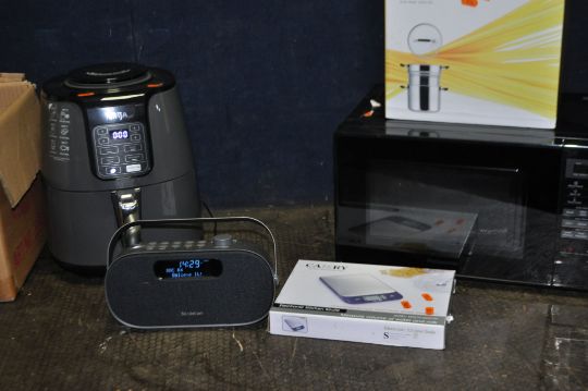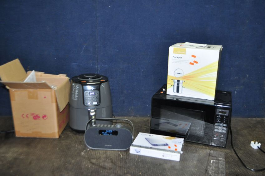 A SELECTION OF HOUSEHOLD ELECTRICAL ITEMS, including of a Ninja air fryer, a Panasonic microwave, a Sandstrom DAB radio (all PAT pass and working), a Camry Digital scale, a coffee machine and a Pasta pot (6)