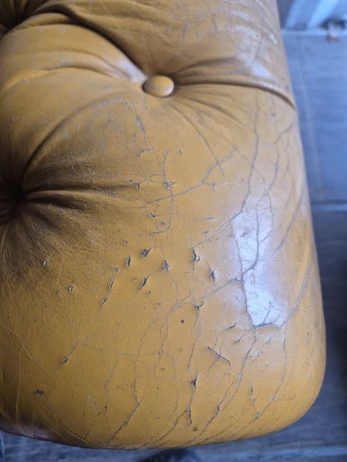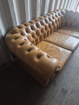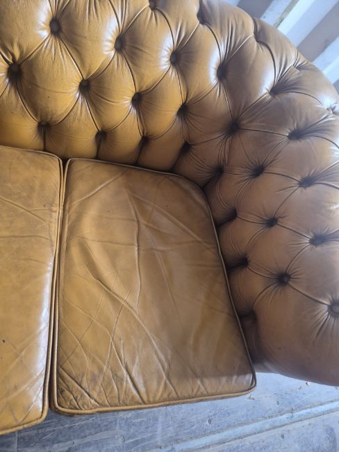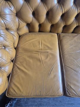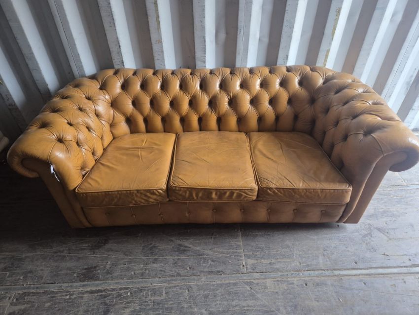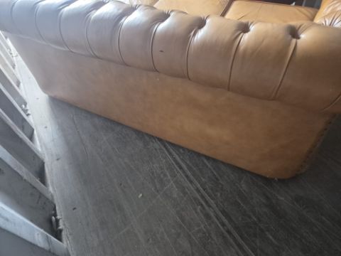 A TAN LEATHER THREE SEATER CHESTERFIELD SOFA, 192cm x depth 92cm x height 65cm, condition report: appears condition, with no tears to arms apart from cat scratches (1)