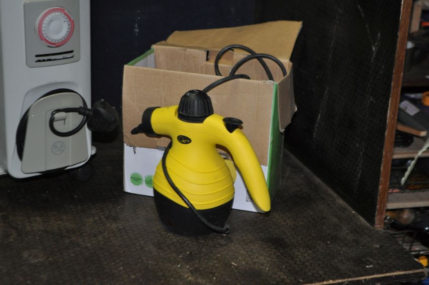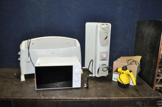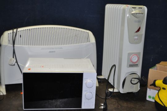 A COLLECTION OF HOUSEHOLD ELECTRICAL ITEMS, including two DeLonghi heaters, a Tesco microwave, a Tower vacuum cleaner and a Quest steam cleaner (all PAT pass and working) (5)