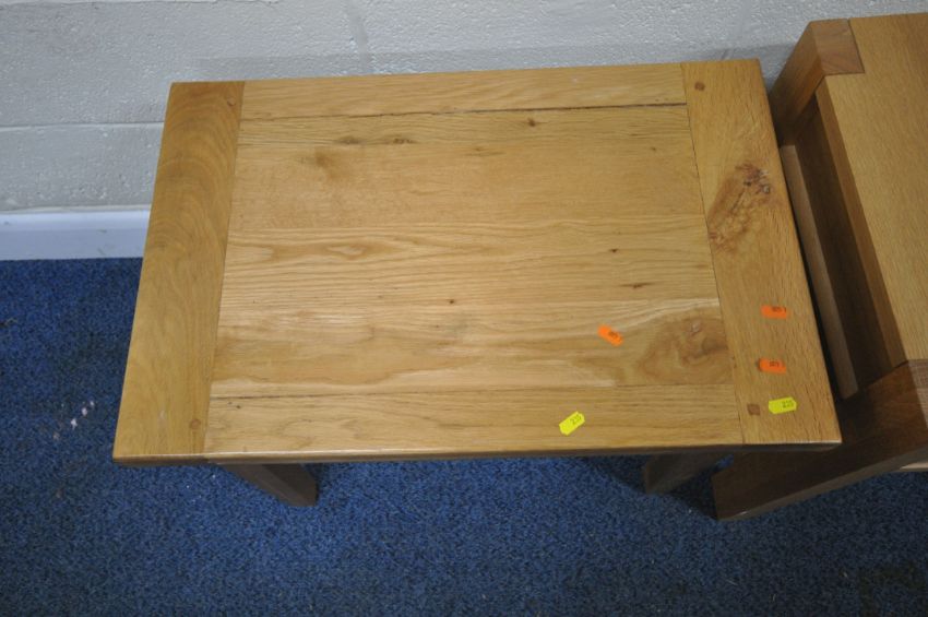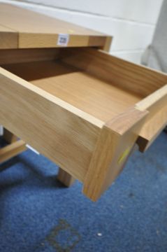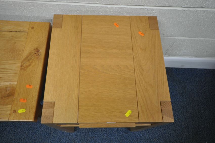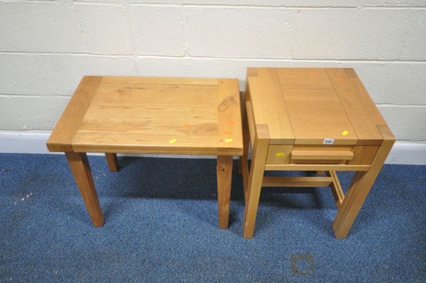 A MODERN SOLID OAK LAMP TABLE, with a single drawer, 45cm squared x height 60cm, along with a coffee table, condition report: general signs of usage (2)