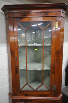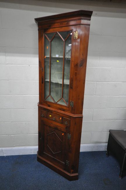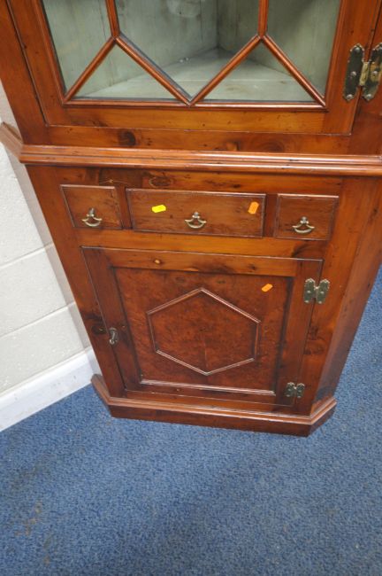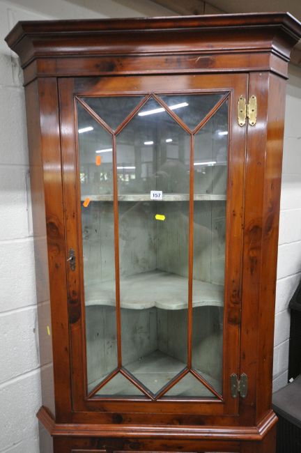 A GEORGIAN CORNER CUPBOARD, with a single glazed door, a single drawer and two dummy drawers, over a single cupboard door, width 79cm x depth 47cm x height 207cm, condition report: appears to have later yew wood appearance, two keys, minor marks, scuffs, other general signs of wear and usage (2 sections)
