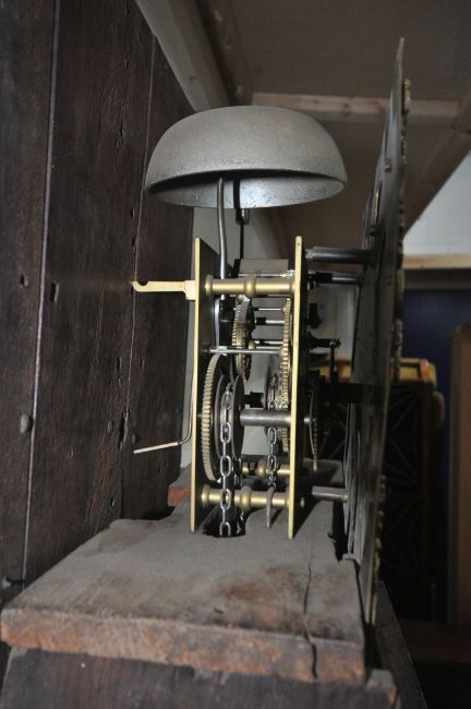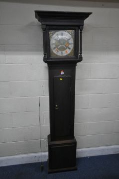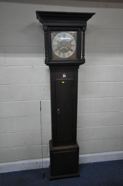JOSEPH SILL, WIGTON, A GEORGIAN OAK CASED 30 HOUR LONGCASE CLOCK, the box hood with a square glass door, that’s enclosing an 11.5 brass and silvered dial, depicting Roman and Arabic numerals, and a subsidiary date aperture, over a single trunk door, raised on a box plinth, height 203cm, condition report: untested, one pendulum, no weight, historical marks, scuffs, stains, discolouration, leans slightly forwards, other wear and usage