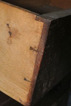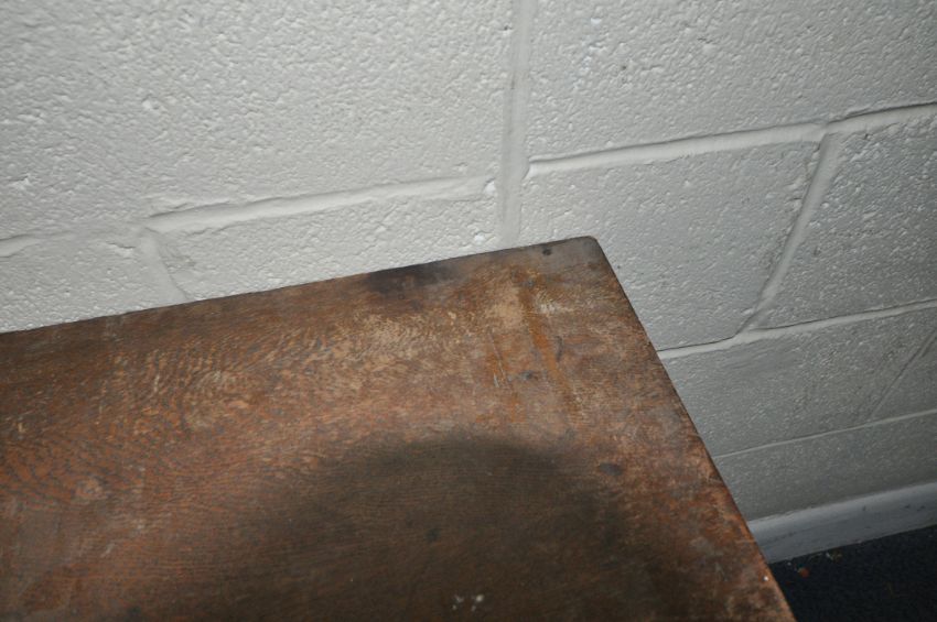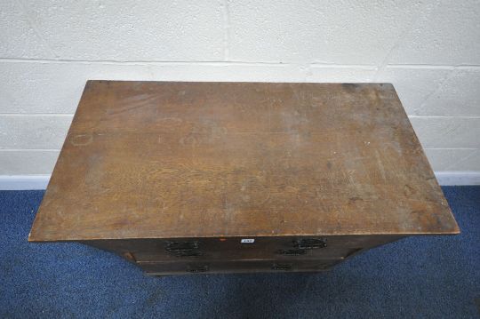 AN EARLY 2OTH CENTURY OAK CHEST OF THREE DRAWERS, raised on bracket feet, width 92cm x depth 46cm x height 79cm, condition report: holes to surface where a raised back would have sat, drawers don’t sit on the runners properly, historical marks, scuffs, stains, discolouration, other wear and usage