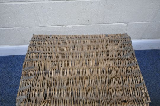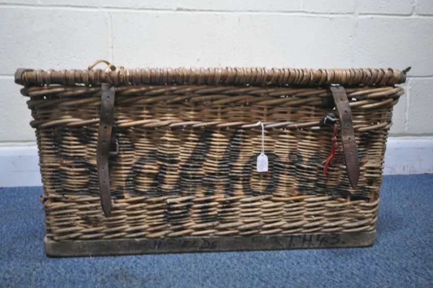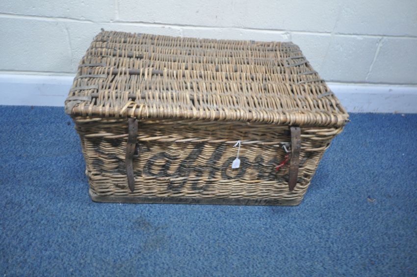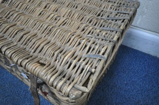 A VINTAGE WICKER BASKET, with a hinged lid, leather straps to the front, reading Stafford, width 78cm x depth 54cm x height 38cm, condition report: historical marks, scuffs, losses, discolouration, other wear and usage