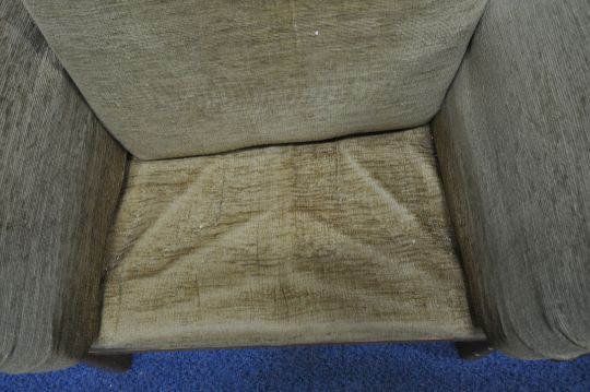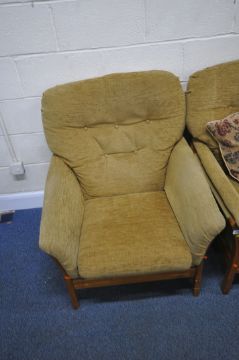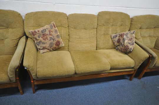 A TEAK FRAMED THREE PIECE LOUNGE SUITE, comprising a three seater sofa, length 178cm x depth 90cm x height 90cm, along with a pair of armchairs, condition report: marks, scuffs, discolouration, ideal for a clean, other wear and usage (3)