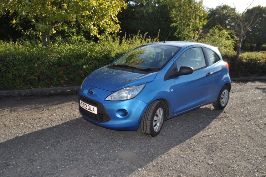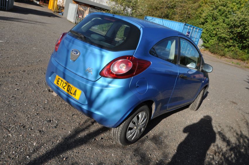 A 2012 FORD KA STUDIO 3 DOOR HATCHBACK CAR in blue, with a 1242cc petrol engine, five speed manual gearbox, V5C present, two keys, 5 former keepers, first registered 31/07/2012 with number plate ET12 OLA, some Service History (missing 2018, 2022, 2023, 2024 and 2025), some receipts for previous work, Odometer reads 106790 miles (tallies with history), MOT expires October 2025. Condition Report: slight damage to front bumper, interior has no obvious rips, tears or wear, starts and drives but has a metallic rattle from exhaust or suspension