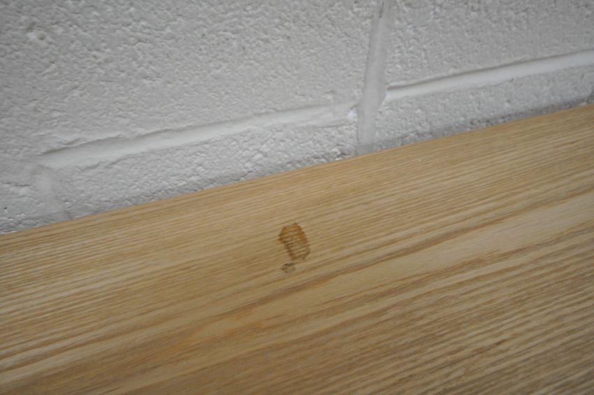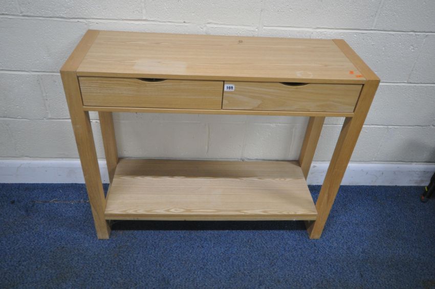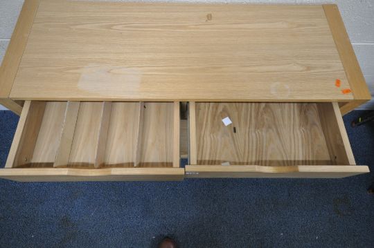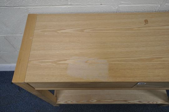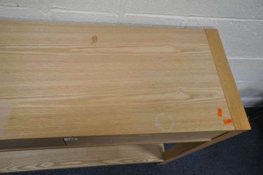 A MODERN LIGHT OAK SIDE TABLE, fitted with two frieze drawers, raised on square legs, united by an undershelf and stretchers, width 100cm x depth 36cm x height 80cm, condition report: marks, scuffs, stains, discolouration, other wear and usage