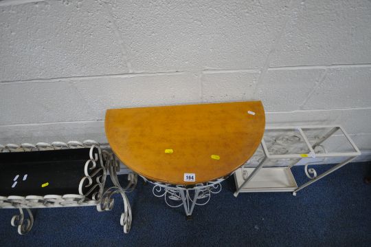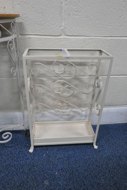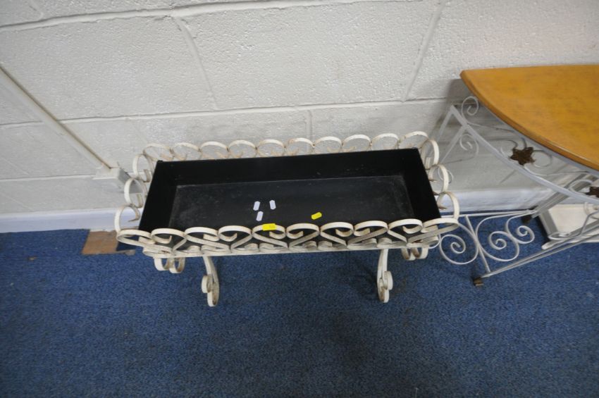 THREE PIECES OF WHITE PAINTED METAL OCCASIONAL FURNITURE, to include a demi-lune side table, width 61cm x depth 30cm x height 71cm, an umbrella stand, and a planter, condition report: marks, scuffs, other general signs of wear and usage (3)