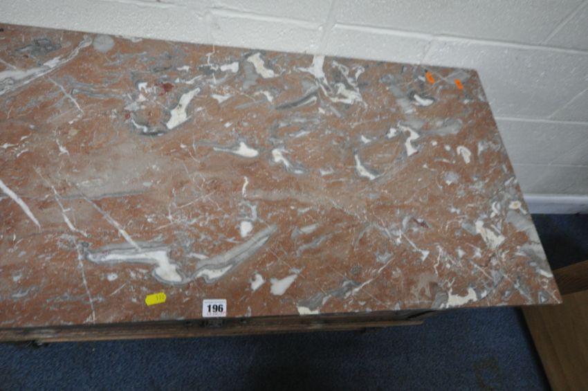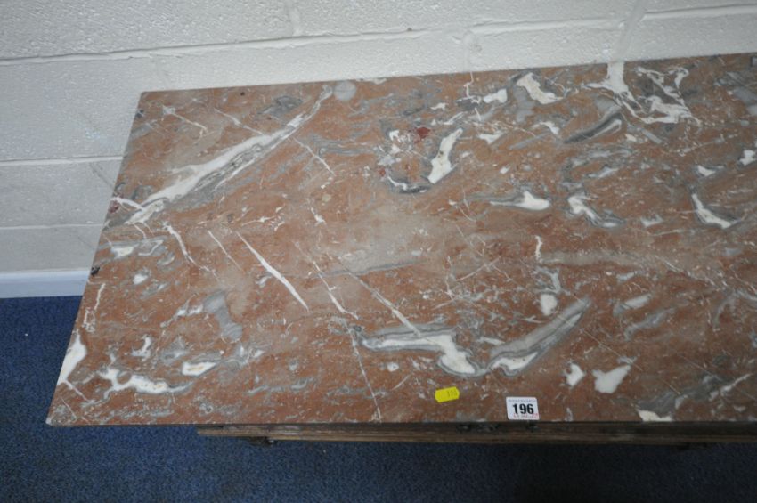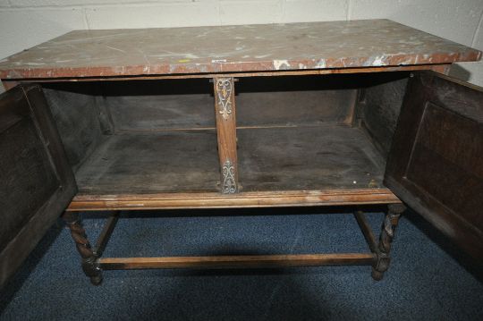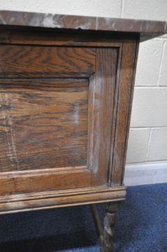 AN EARLY 20TH CENTURY OAK MARBLE TOP WASH STAND, with double cupboard doors, raised on barley twist supports, united by stretchers, width 107cm x depth 49cm x height 77cm, condition report: missing raised back, historical marks, scuffs, stains, losses to fretwork, discolouration, other wear and usage