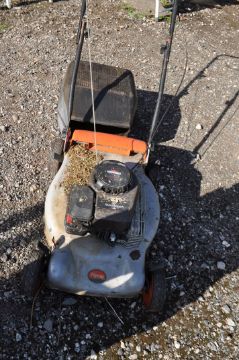A FLYMO PETROL LAWN MOWER with grassbox (engine pulls freely but hasn't been started). Condition Report: rust to body and paint losses