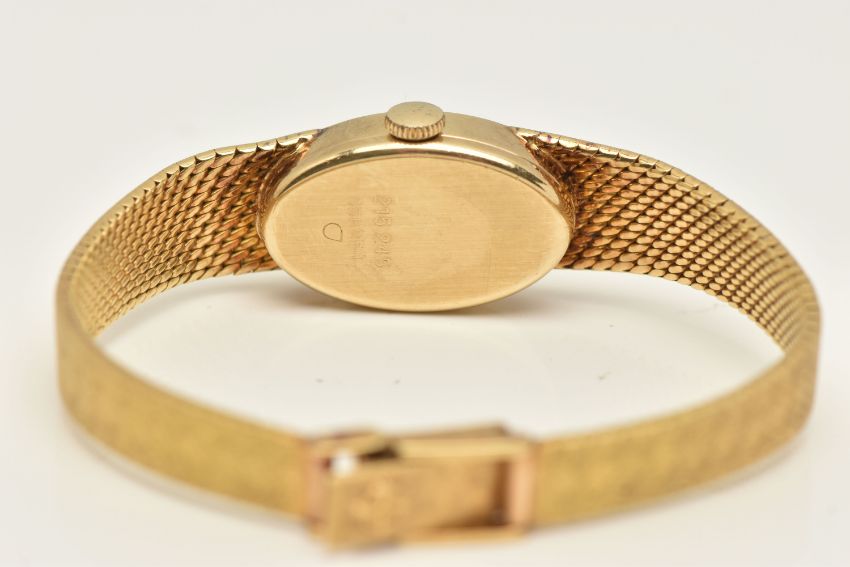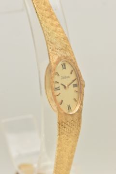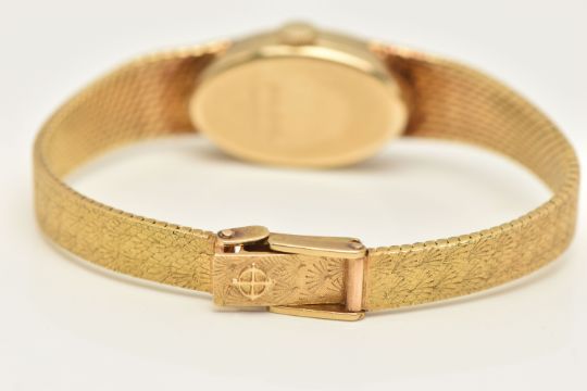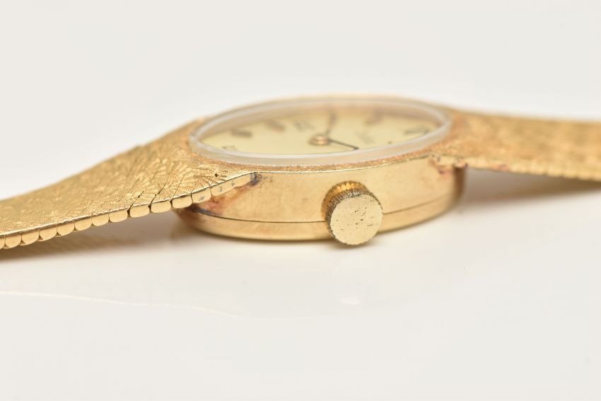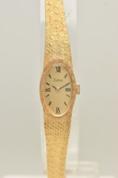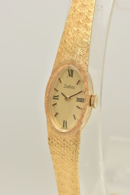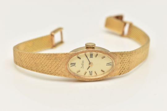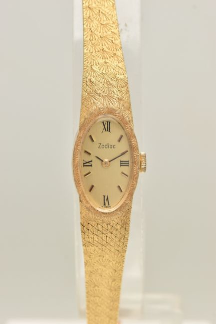 A LADIES YELLOW METAL 'ZODIAC' WRISTWATCH, manual wind, oval gold tone dial signed 'Zodiac', Roman numeral twelve, three, six and nine with remaining baton markers, within a polished case, inside case back stamped 18k, 0.750 Swiss control marks, calibre number 129, numbered 185126, approximate case width 14.5mm, fitted with a textured articulated bracelet and folding clasp, stamped 750, approximate gross weight excluding movement 24.9 grams (condition report: watch winds and sets, time keeping has not been tested, general light wear)