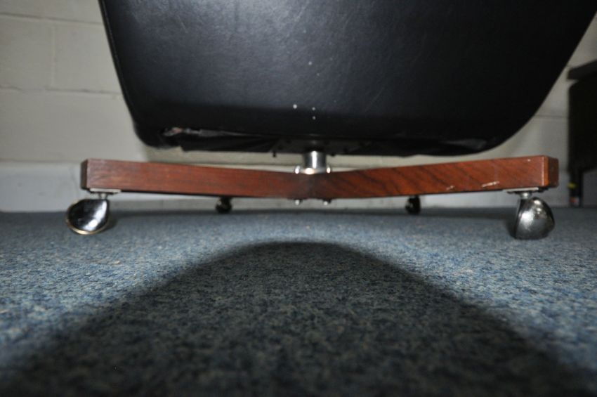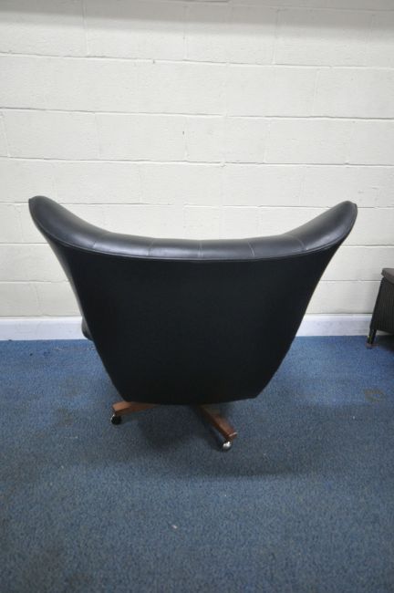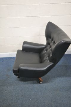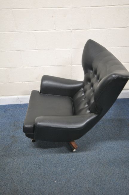 POSSIBLY A G PLAN BLOFELD MID-CENTURY BLACK LEATHERETTE BUTTONED WING BACK BOUNCING ARMCHAIR, raised on four legs with castors, width 89cm x depth 99cm x height 100cm, condition report: no visible makers marks, this chair has no fire regulations label, so it does not comply with the Furniture and Furnishings fire Safety Regulations 1988 and therefore, should not be used in a private dwelling, no visible rips or tears, general signs of usage