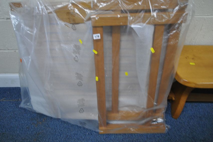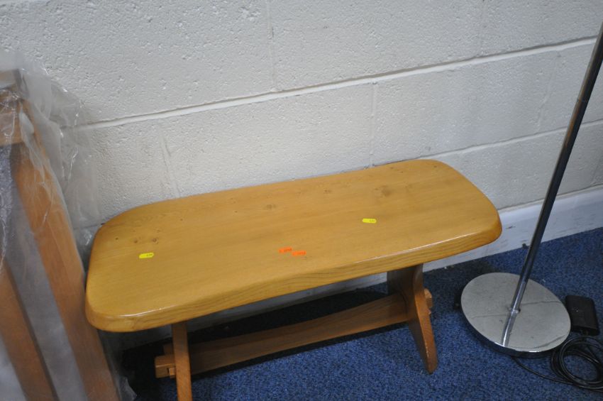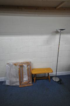 A MODERN WOODEN TABLE, still in its packaging, a small bench, and a standard lamp, condition report: unknown if the table is complete (3)