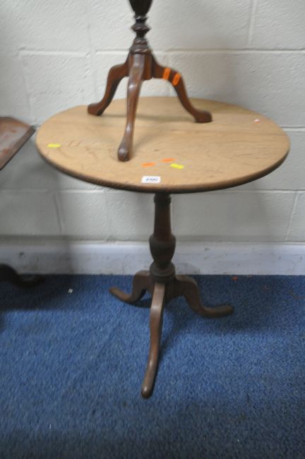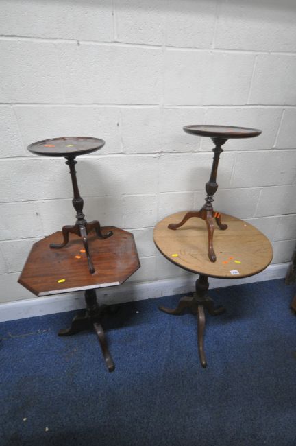 FOUR TRIPOD TABLES, varying in shape, size, style, timber, etc, largest table diameter 58cm x height 73cm, condition report: all ideal for some form of restoration, due to marks, scuffs, stains, loose parts, repairs, other wear and usage (4)
