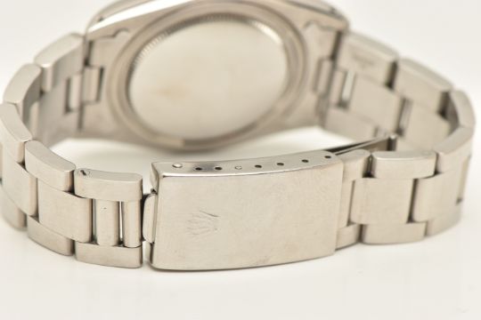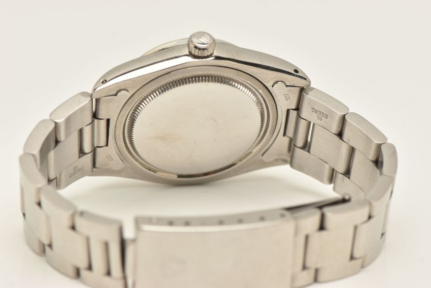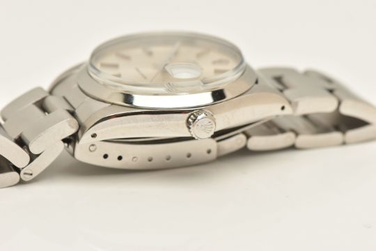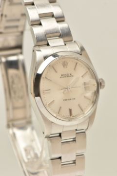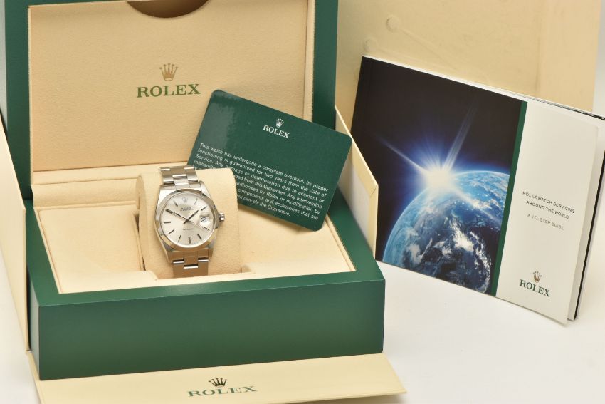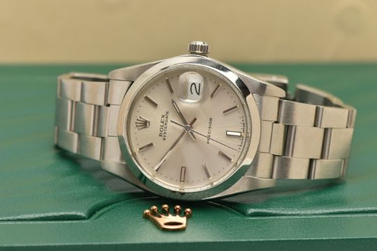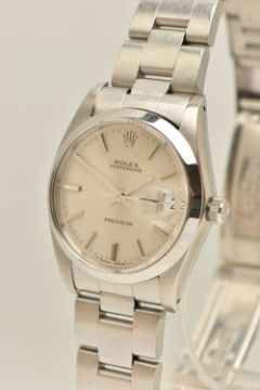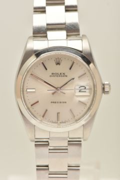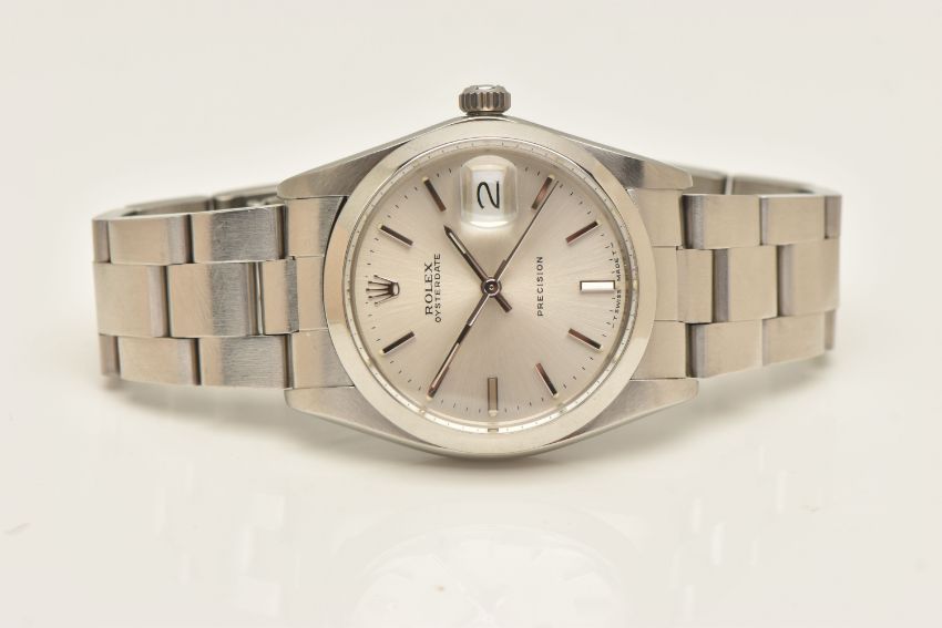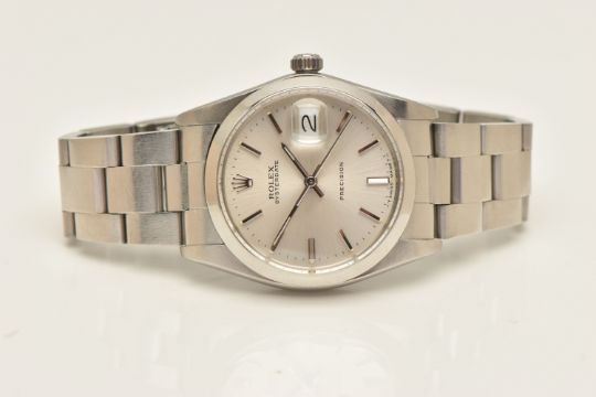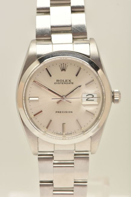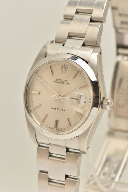 A ROLEX OYSTERDATE PERPETUAL WRISTWATCH, the silver coloured dial, with luminous silver coloured hourly applied markers, silver coloured hands and second sweep, date window at three o'clock with cyclops Lense, the dial is singed 'Rolex Oyster Date Precision, -T Swiss Made T-', model number 6694, serial number 9088153 dated approx. 1986, watch with accompanying Rolex international service guarantee card dated 28th June 2016 and accompanying modern Rolex box and outer case, approx. case diameter 34mm, automatic movement, approx. gross weight 83.01 grams (condition report: overall condition very good, light scratches and scuffs in keeping with general wear, we cannot guarantee the accuracy or working order of any watch sold)