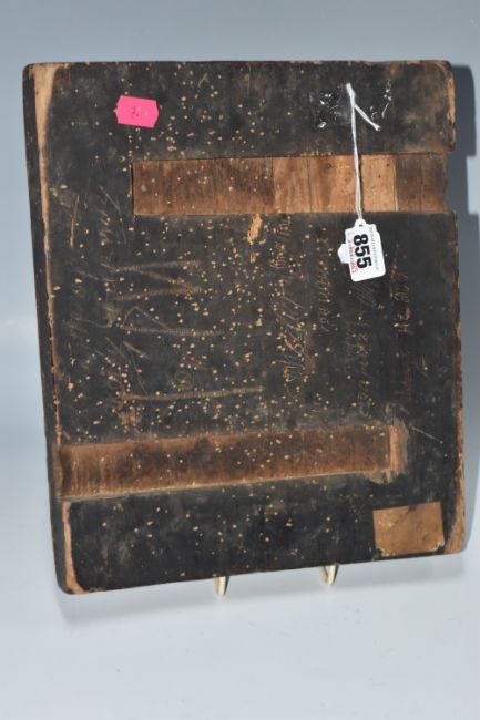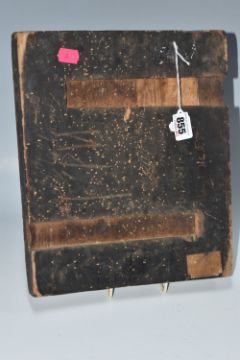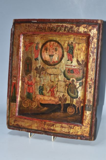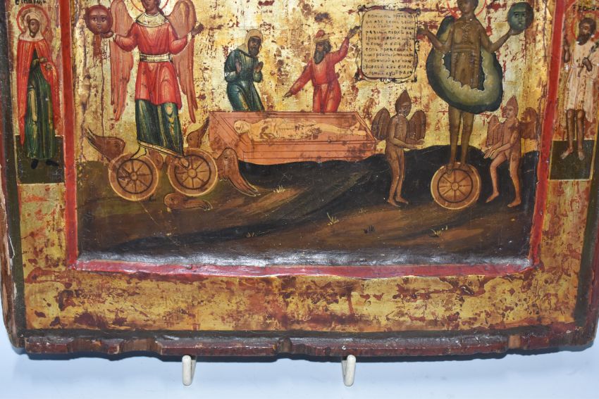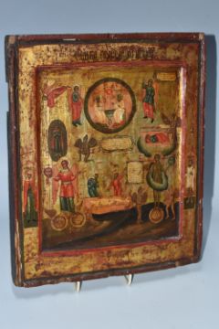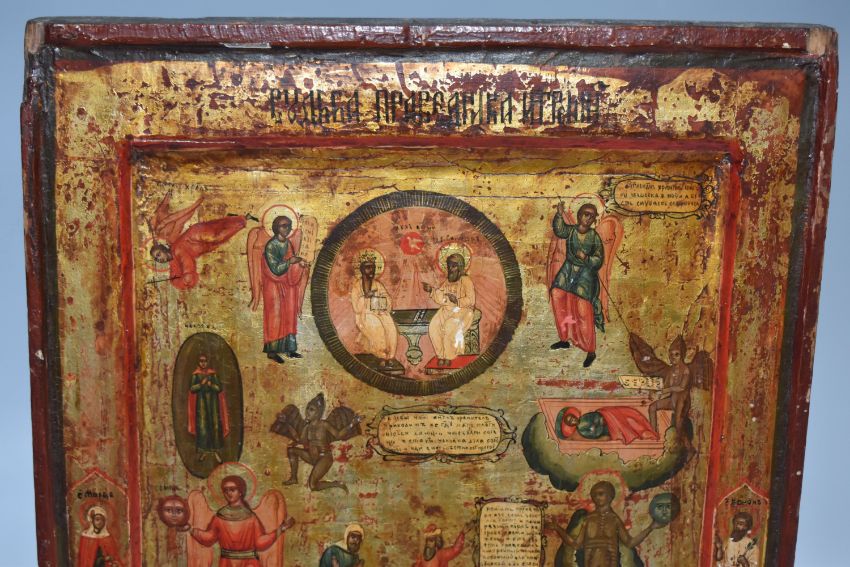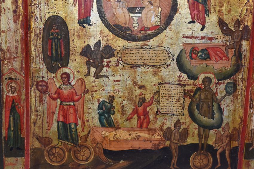 AN ORTHODOX 'SOUL' ICON with a raised border with a central panel depicting the righteous and sinful soul in the Russian tradition, heavy gilding to the image and border, Cyrillic text throughout, (1) (Condition Report: signs of woodworm, some losses to edges and corners, signs of repair, some crazing, no back slats present, Cyrillic etching to the reverse)