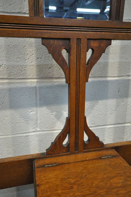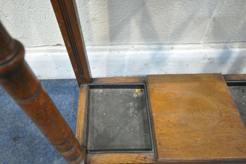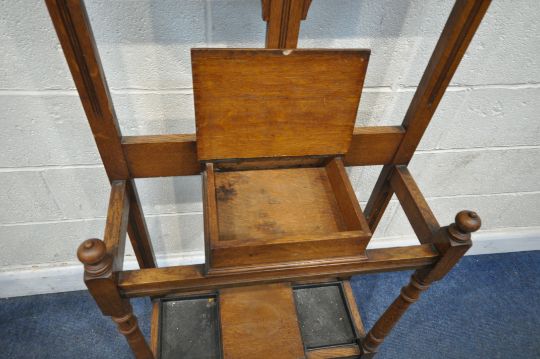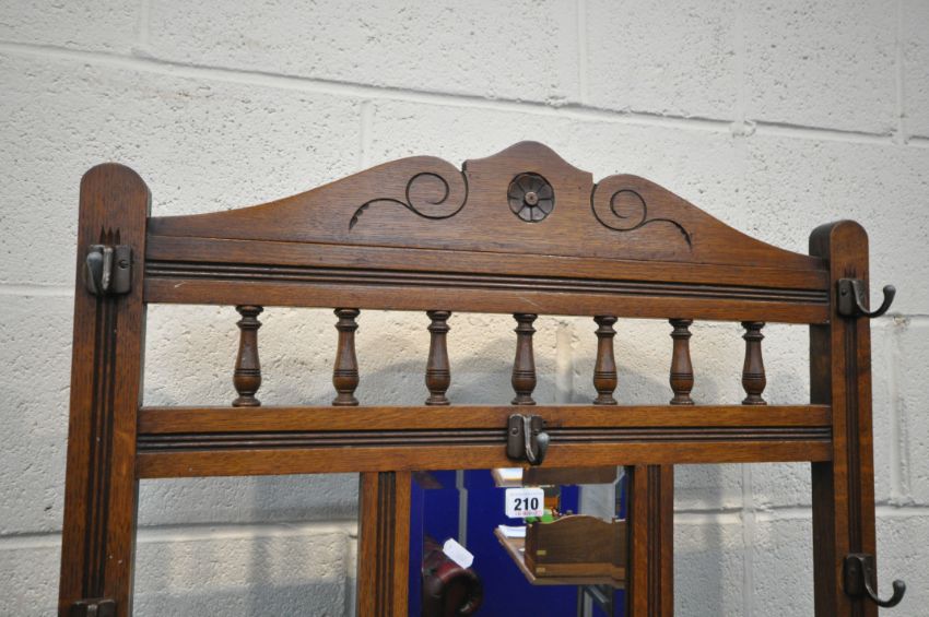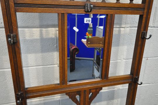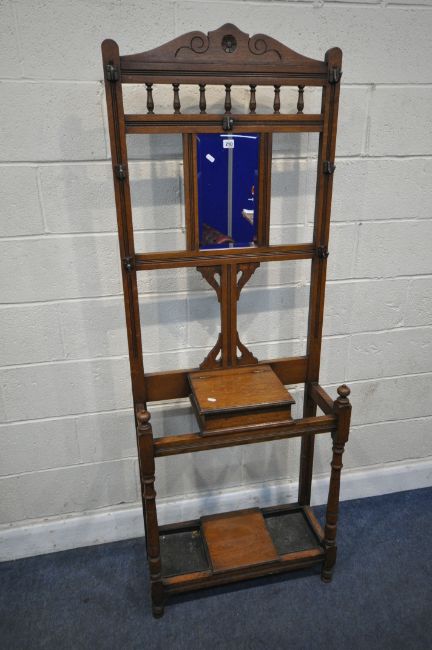 AN EARLY 20TH CENTURY OAK HALL STAND, with seven hooks surrounding a rectangular bevelled mirror, over a hinged storage compartment, twin finials, raised on turned front supports and two drip trays, width 69cm x depth 29cm x height 188cm, condition report: general signs of wear and usage