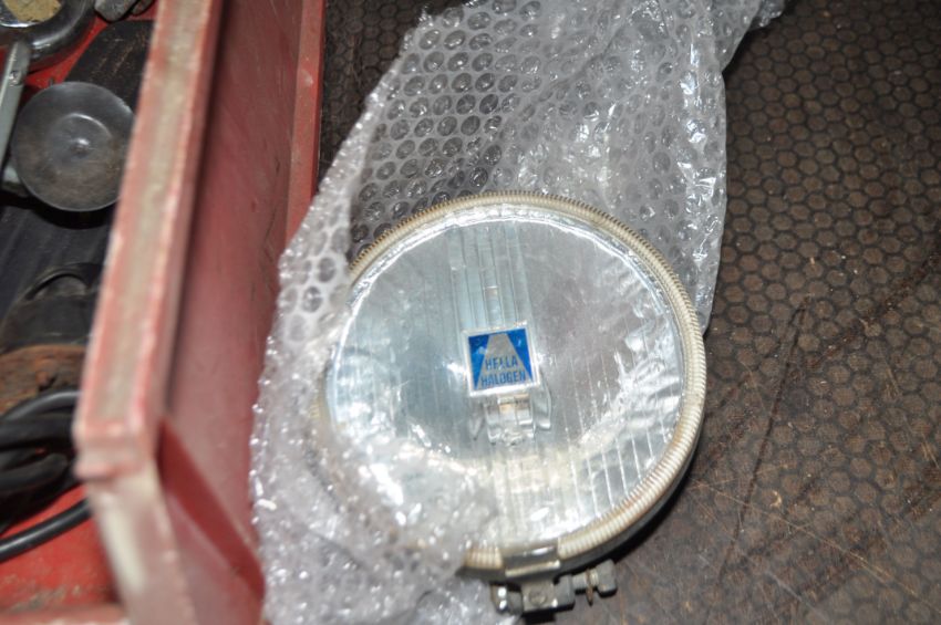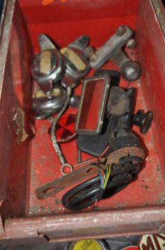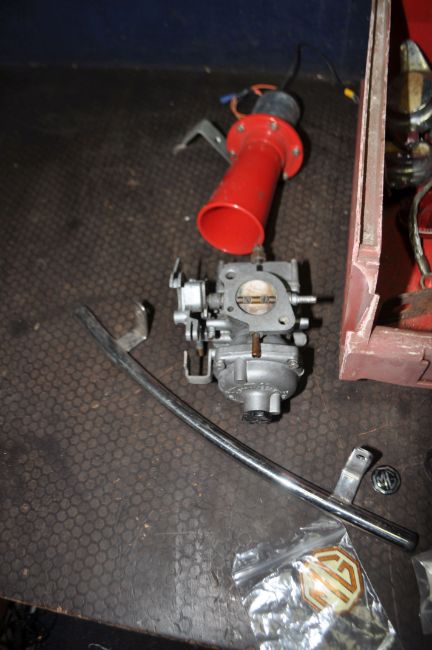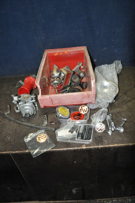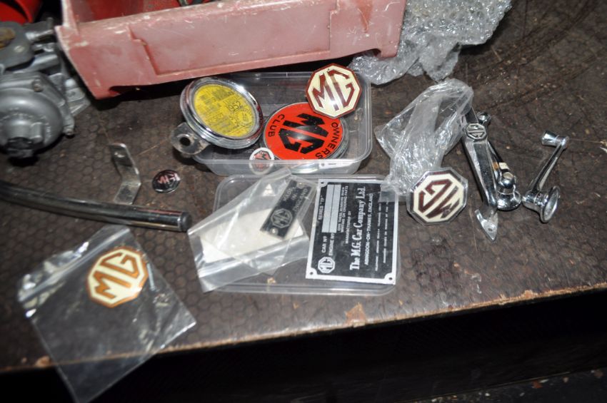A TRAY CONTAINING MG VINTAGE CAR PARTS including a Stromberg CD carburettor, various MG badges and vin plate, a Hella spotlight, four eared spinners, a horn etc