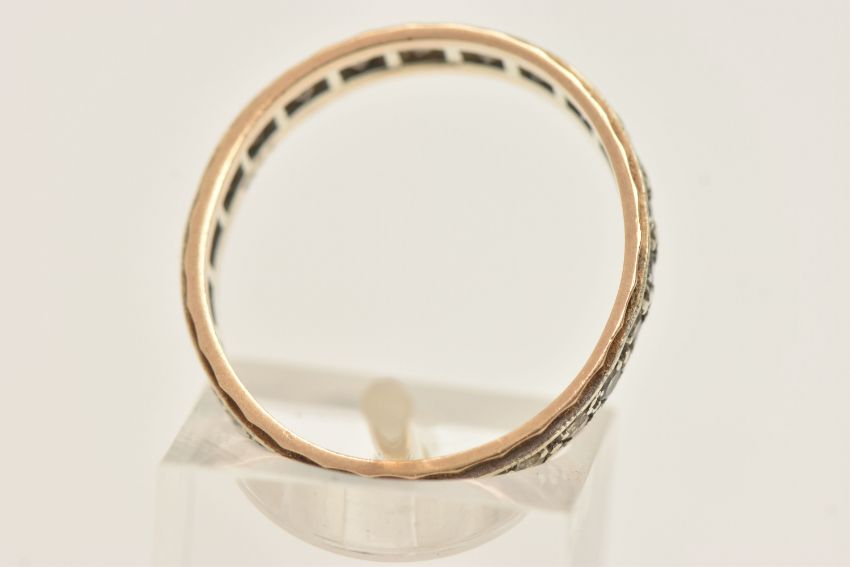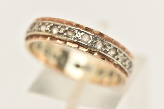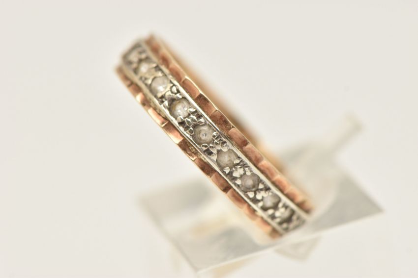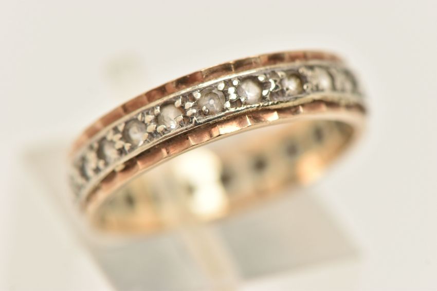 A BI-COLOUR FULL SET ETERNITY BAND, set with a row of colourless spinel's, stamped 9ct, ring size Q 1/2, approximate gross weight 2.8 grams (condition report: slightly misshapen band, would benefit from a gentle clean)