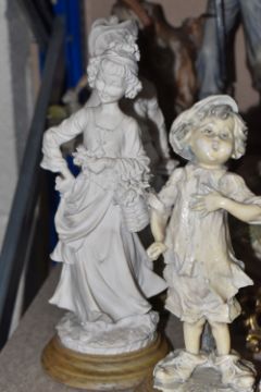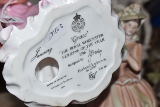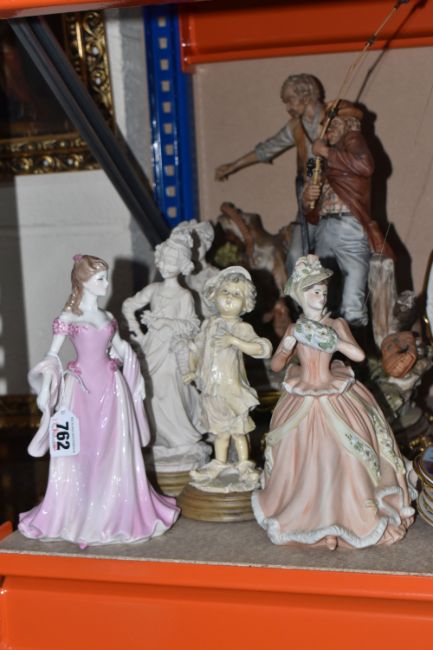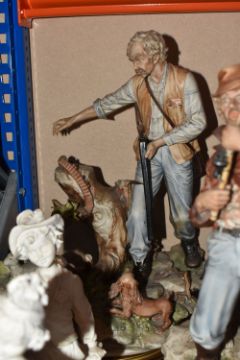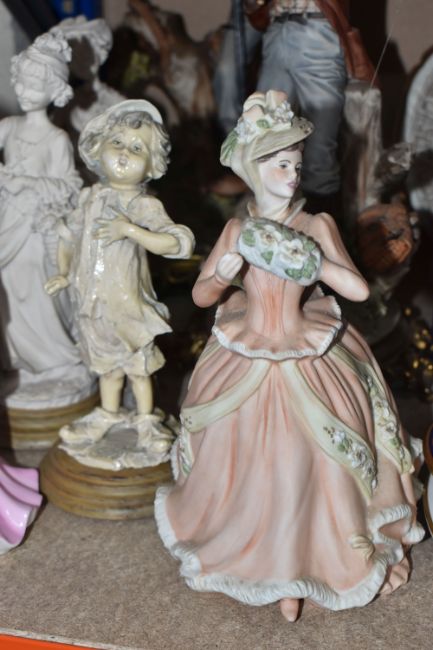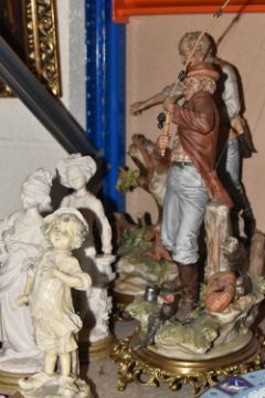 A GROUP SEVEN FIGURINES, comprising Capodimonte figurines comprising, 'The Fisherman' signed Sandro Maggioni, (white paint spots in places, the fishing rod is broken), 'Rabbit Hunter', signed Sandro Maggioni, (white paint marks, rabbits ear is missing, and the hunter missing a finger), both figures raised on an ornate brass base, and have the blue Capodimonte symbol, together with three Giuseppe Armani figurines 'Singing Boy', (age related wear on the face area) 'Lady with a flower basket' and 'Boy leaning on a wall', all on wooden plinths, a Wedgwood figurine, matt finish, by' Shirley' Curzon, Royal Worcester 'Grace' by J. Bromley, (7), (Condition Report: see main description for itemised damage overall ok)