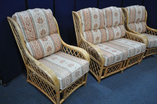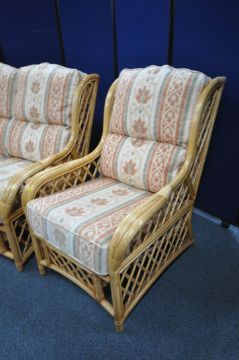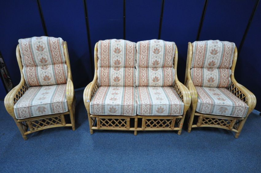 A WICKER CONSERVATORY SUITE, with floral cushions, comprising a two seater sofa, width 123cm, and a pair of armchairs 77cm