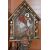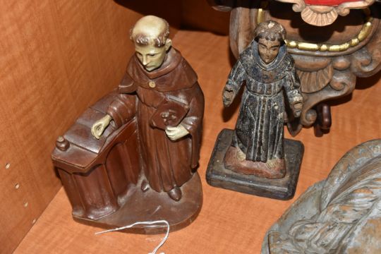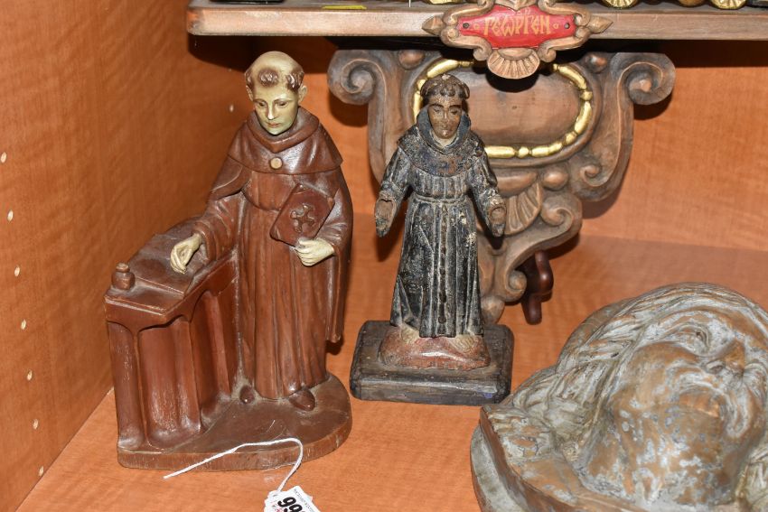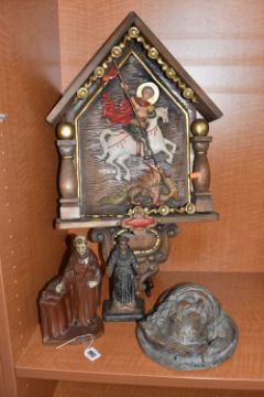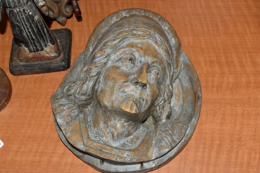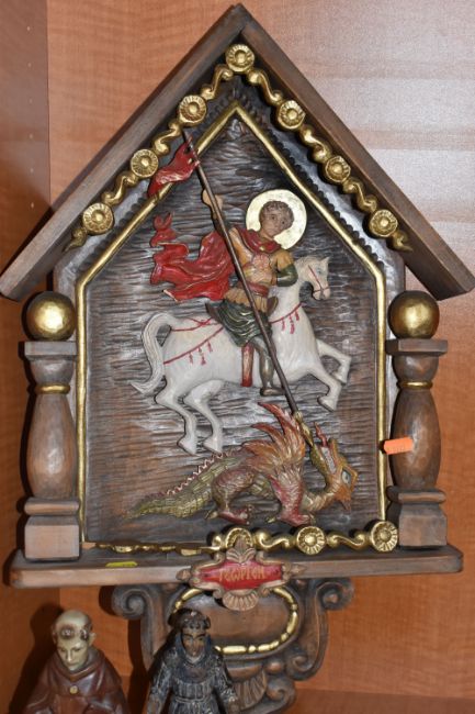FOUR CARVED RELIGIOUS SCULPTURES to include a large carved image of St George killing the dragon surrounded by a canopy and framed edge, finial to the lower end, Slavonic script to the label, height 68cm x width 38cm (some of the gilt decorative rosettes loose from the lower band), two carved saintly figures (loss to hands, chip to paint, signs of repair), and a wooden relief roundel of an unidentified male figure in renaissance/high medieval costume, height 26cm x width 20cm (signs of woodworm, loss to paint, cracks) (4) (Condition Report: itemised conditions above, all sold a/f)