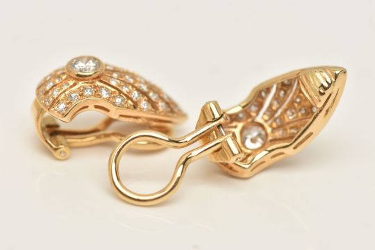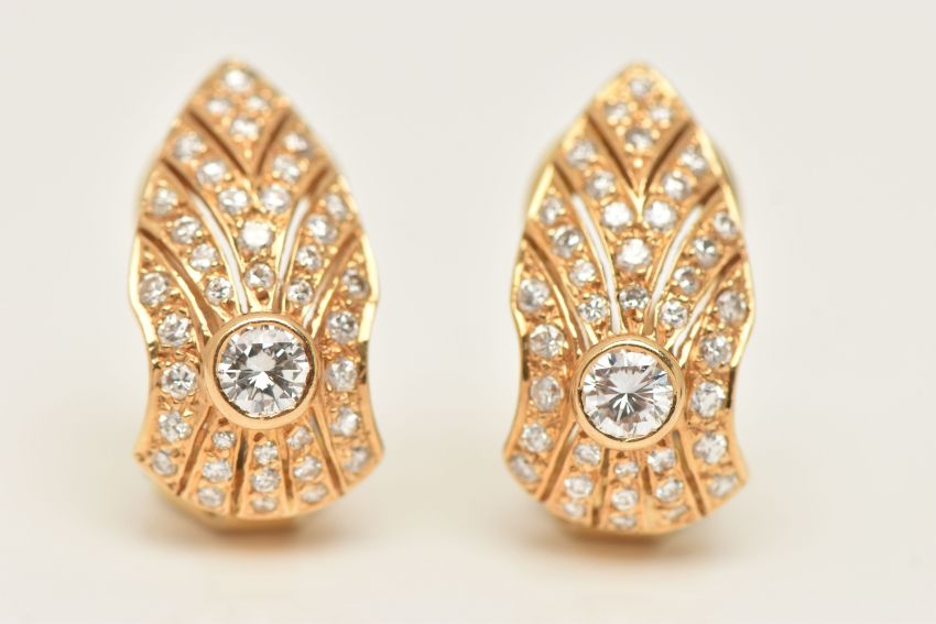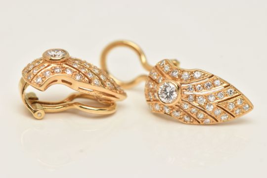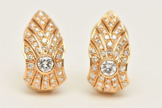 A PAIR OF 18CT GOLD DIAMOND SET CLIP ON EARRINGS, each earring set with a central round brilliant cut diamond approximately 0.15ct, encrusted with smaller round brilliant cut diamond accents, fitted with hinged clip back fittings for non-pierced ears, hallmarked 18ct London, approximate length 18.4mm, approximate gross weight 5.9 grams (condition report: overall condition very good, clip backs in working order, nice bright diamonds)