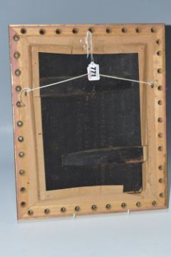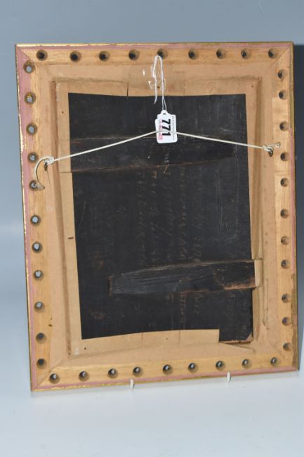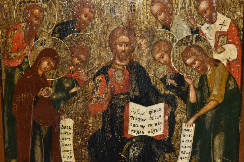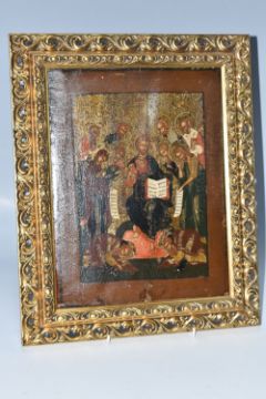 AN ORTHODOX 'CHRIST PANTOCRATOR ON THE THRONE' ICON, oil on wood board, a Russian school nineteenth century icon depicting a seated Jesus Christ flanked by named holy individuals with two prostrated at his feet, back slats present, framed in a modern frame, height 39cm x width 32.5cm) (1) (Condition Report: carved Cyrillic text to the reverse, some curvature, some chips in places, possible signs of historic repair, crazing, signs of historic woodworm)