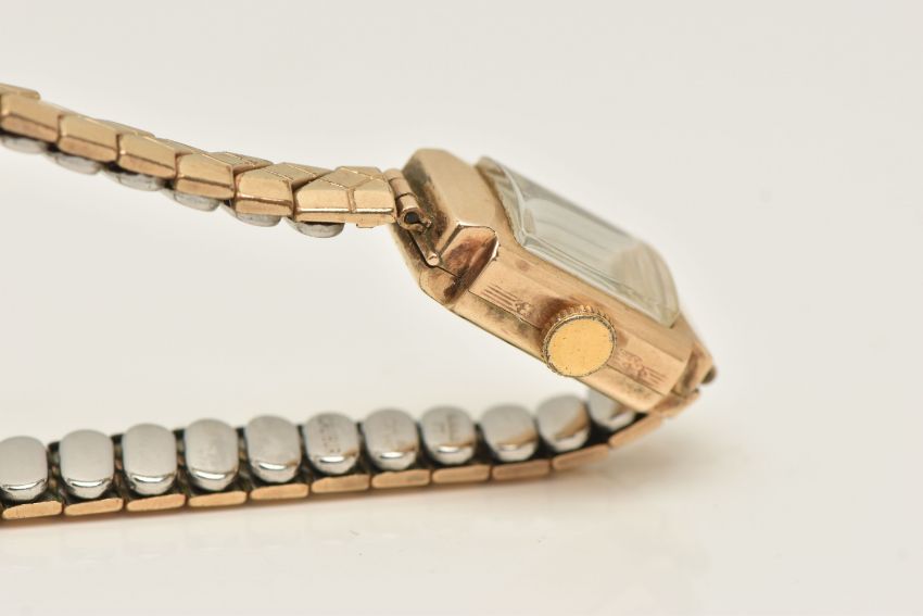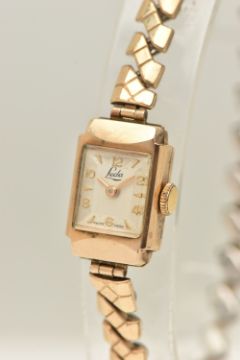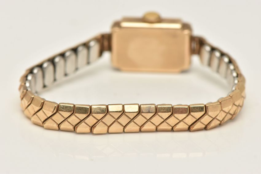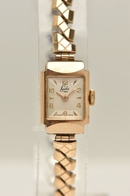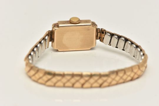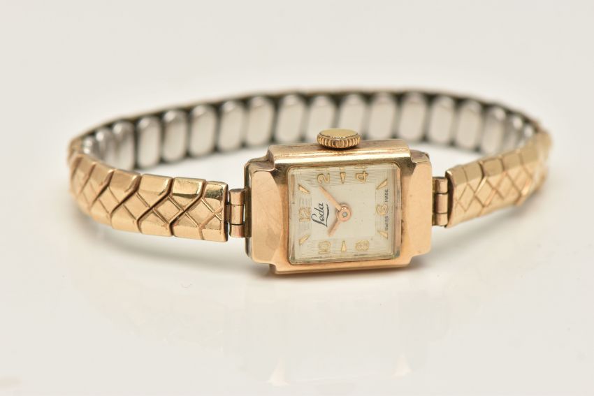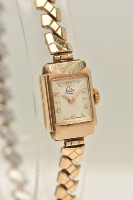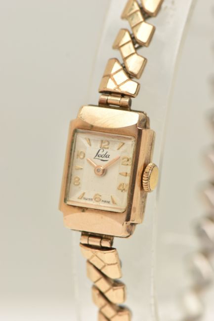 A LADIES 9CT GOLD CASED 'LEDA' WRISTWATCH, manual wind, silvered rectangular dial signed 'Leda', alternating Arabic numeral and baton markers, inside case back hallmarked 9ct Edinburgh, approximate case length 20.5mm x width 14.0mm, approximate case back weight 1.4 grams, fitted with a stretch link rolled gold bracelet (condition report: watch winds, sets and runs at time of cataloguing although time keeping has not been tested, general light wear, we cannot guarantee the working order of any watch)