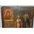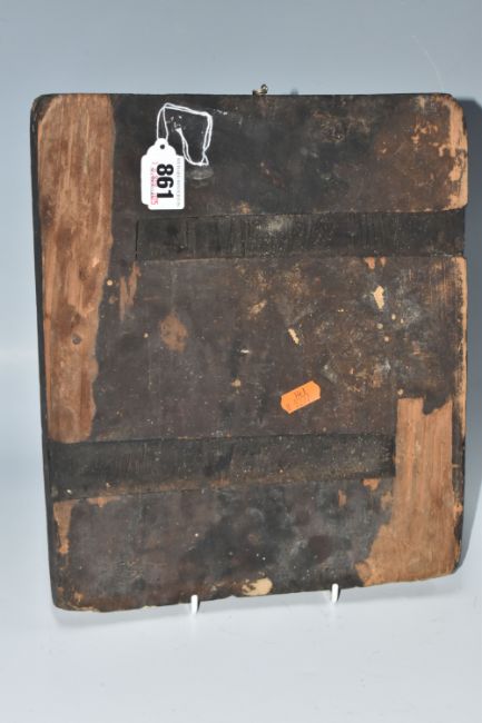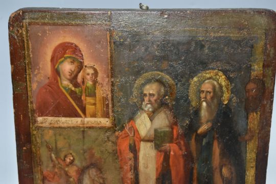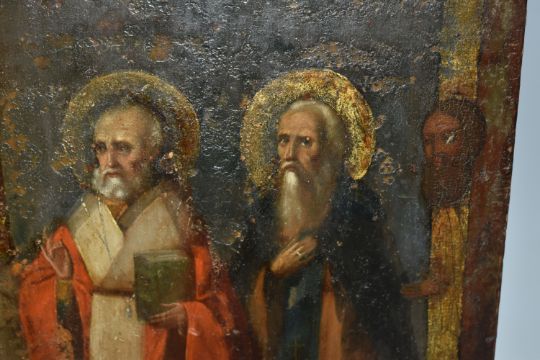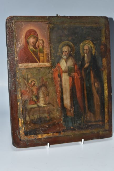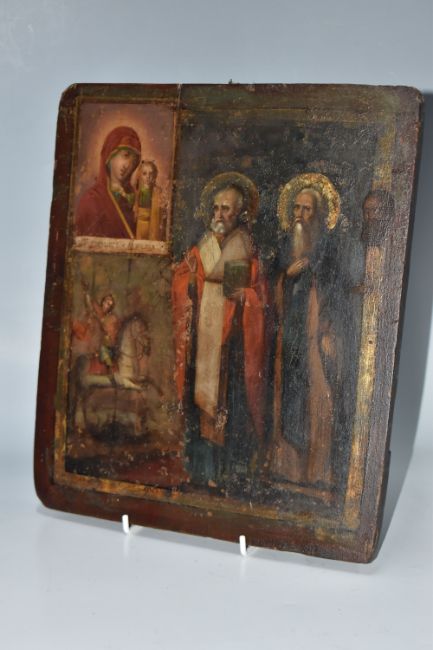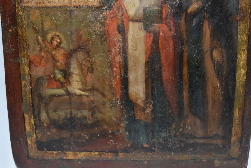 AN ORTHODOX ICON depicting two saintly figures, with a small St George scene, height 31cm x width 27cm (1) (Condition Report: signs of woodworm, chips to the edges of the wood, no back slats present, loss to the wood on the back, wear to the image)