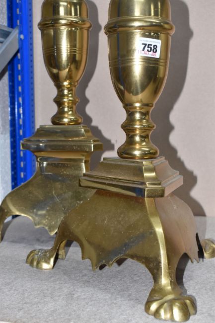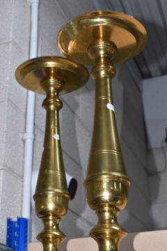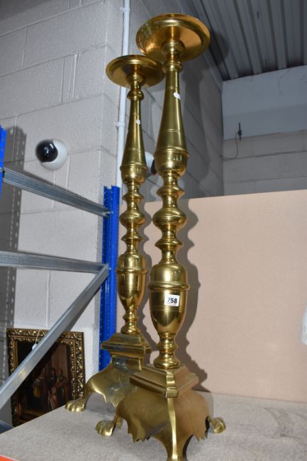 A PAIR OF LARGE BRASS VINTAGE CANDLE STANDS, featuring turned column detail, triangular base with paw feet, (2), (Condition Report: would benefit a clean and have signs of Verdigris)