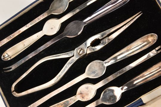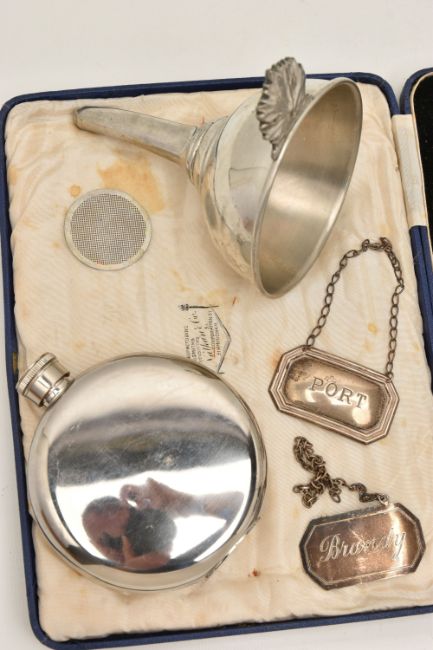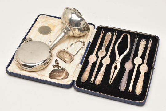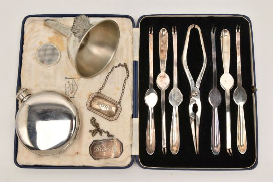 A SMALL BOX OF ASSORTED ITEMS, to include two silver decanter labels, one for 'Port' the other for 'Brandy', both with full silver Birmingham hallmarks, approximate gross weight 20.2 grams, together with a cased set of six triple plated lobster picks and crackers, a stainless steel 5oz hipflask and a white metal funnel stamped 'Made in France'