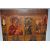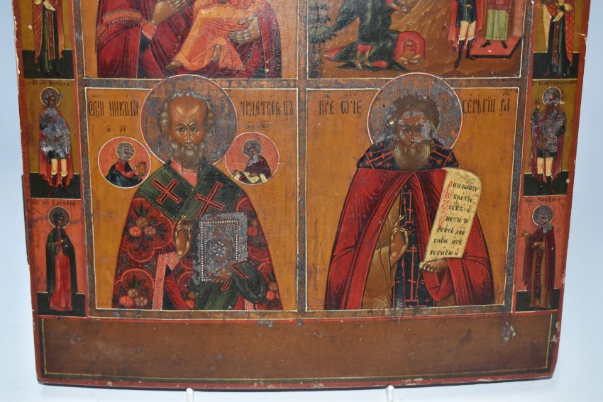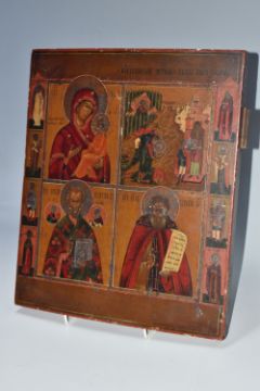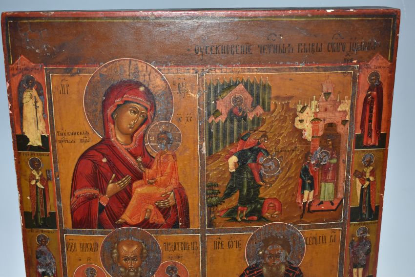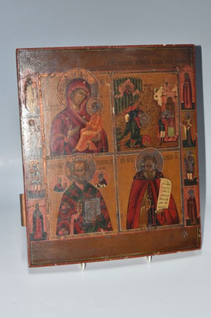 AN ORTHODOX ICON depicting four panels with holy figures to the left and right borders, the panels depicting the Holy Mother and Jesus Christ, the decapitation of John the Baptist, Saint Nicholas and anoter (Sergei?), two backslats to the reverse, height 35.5cm x width 31cm (1) (Condition Report: some chips and scratches, a slight curvature, minor signs of woodworm)