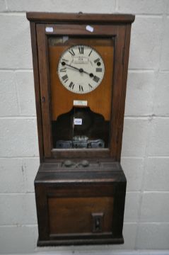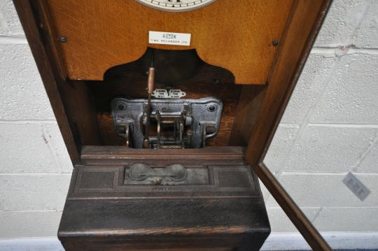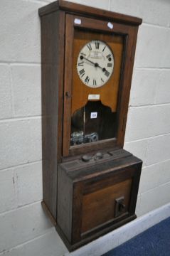 AN EARLY TO MID 20TH CENTURY OAK CLOCKING IN MACHINE, the enamel dial reads a label 'AutoK Time recorder company Ltd' stuck over further branding. 36cm x depth 31cm x height 91cm, condition report: lever appears working order, not fully tested, one door key