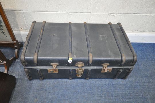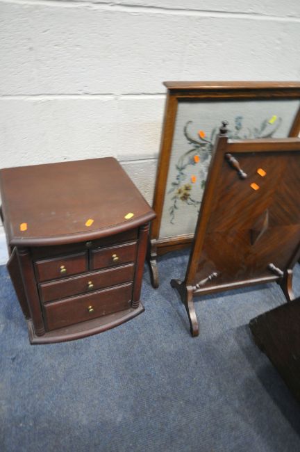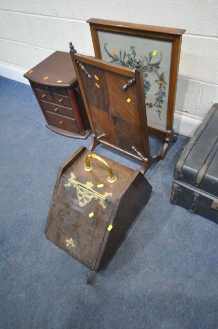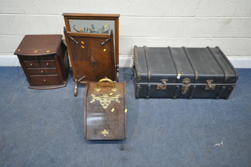 A SELECTION OF OCCASIONAL FURNITURE, to include a travelling trunk, two fire screens, a coal scuttle and a magazine table with five drawers, condition report: all with imperfections, such as marks, scuffs, stains, discolouration, other wear and usage (5)