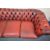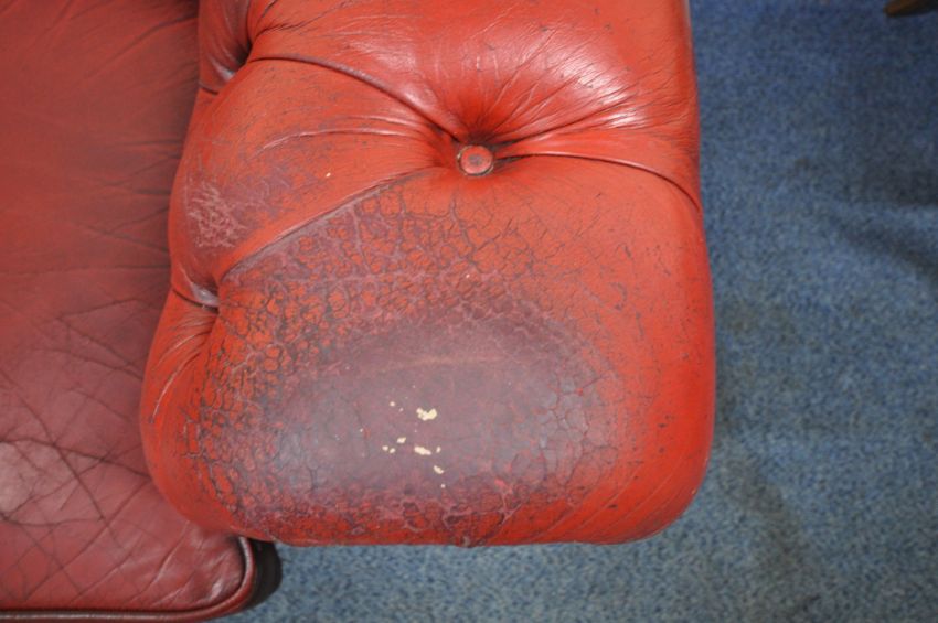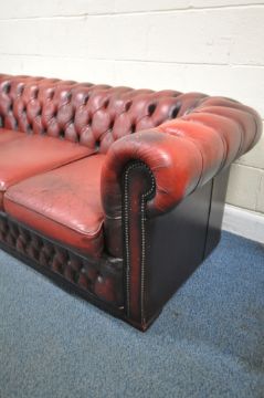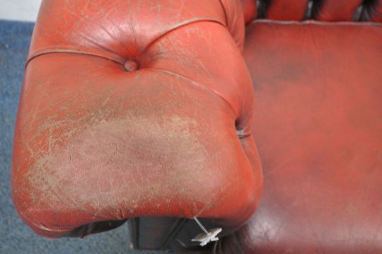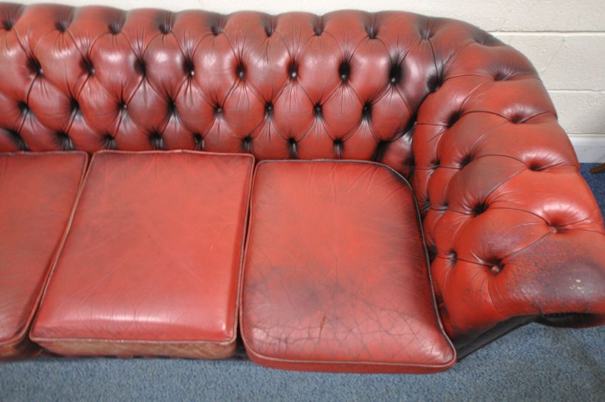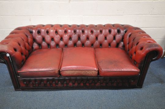 A BURGUNDY LEATHER THREE SEATER CHESTERFIELD SOFA, length 205cm x depth 90cm x height 70cm, Condition Report: leather is tired and worn, the armrest front a particularly more worn but not torn, there is a tear to one area of seat pad