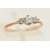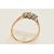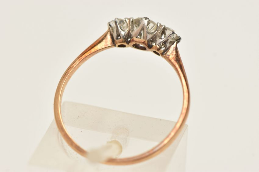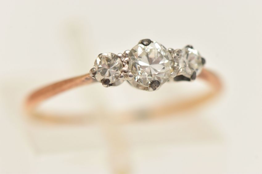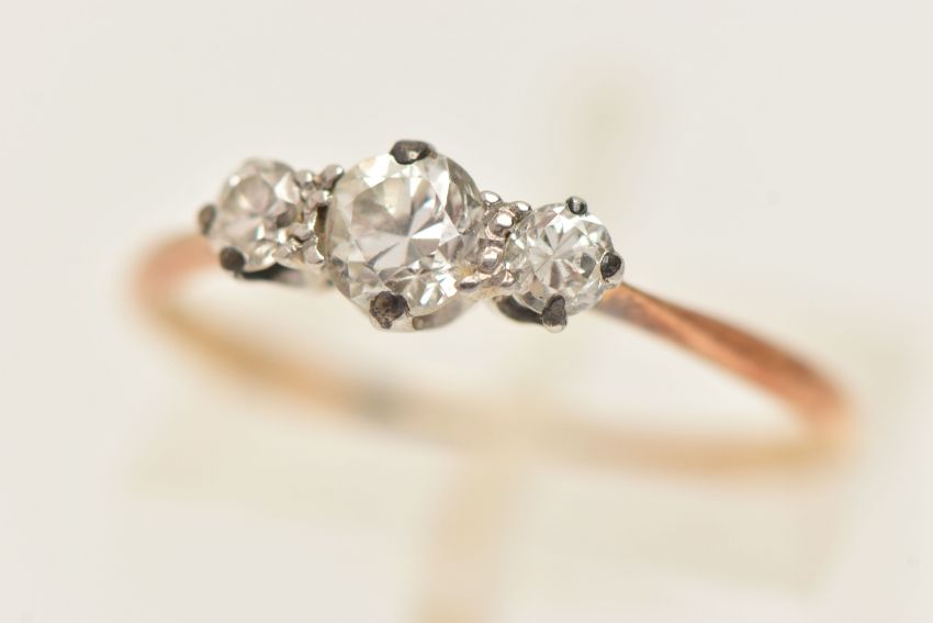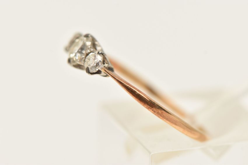 A YELLOW METAL THREE STONE DIAMOND RING, two round brilliant cut diamonds and one transitional cut diamond, estimated total diamond weight 0.40ct, all claw set in a white metal mount, (one claw will require some attention), to the yellow metal pinched shoulder and band, stamped 18ct Plat, ring size M, approximate gross weight 1.5 grams (condition report: will require some attention, one claw is worn, general wear, diamond weight is approximate only, viewing is advised to satisfy requirements)