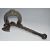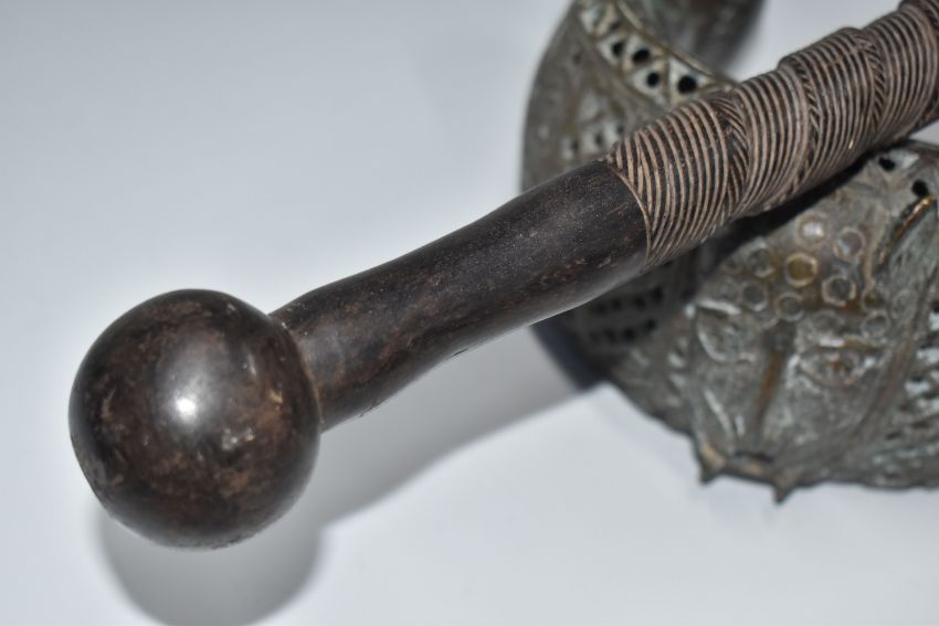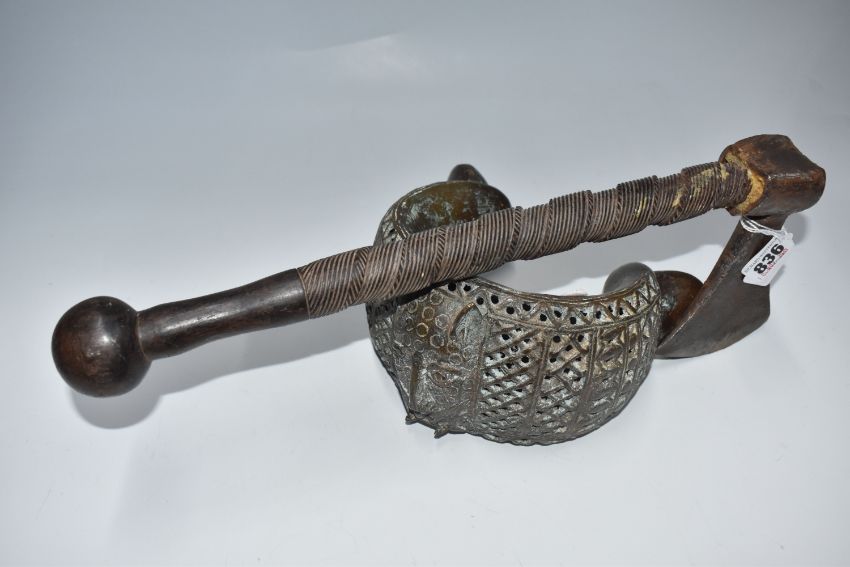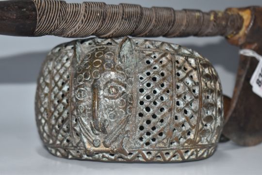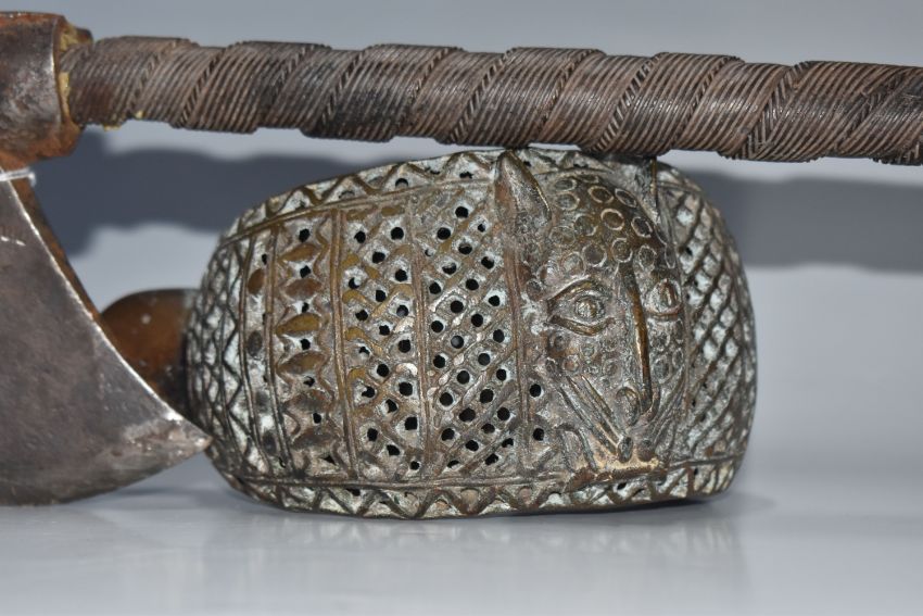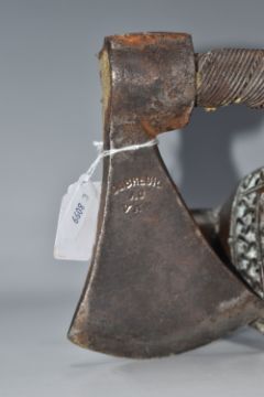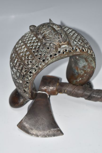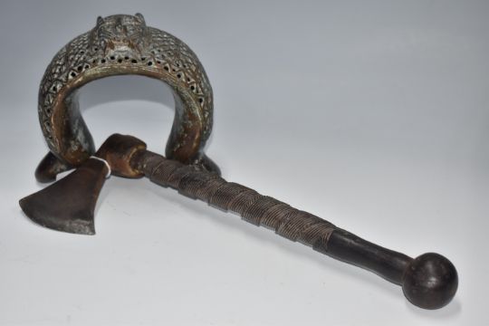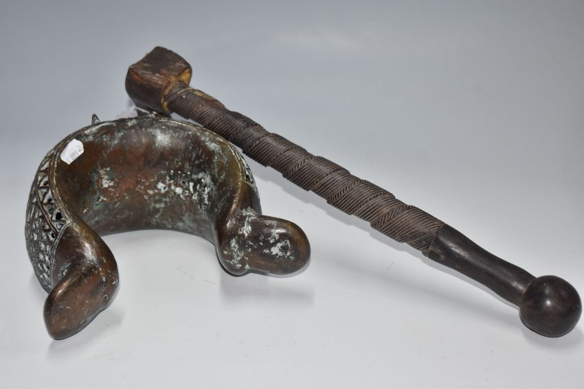 TWO PIECES OF VINTAGE AFRICAN ITEMS, to include a hollow bronze west african bracelet also known as a manilla, geometric cut out patterns and a beasts head on the front, age related wear and verdigris, holes on the inside), together with a tribal axe with carved handle, (age related wear and rust in places, glue residue where the handle and head join), (2), (Condition Report: see main description)
