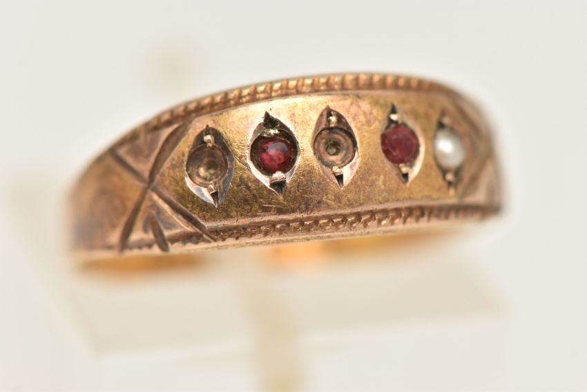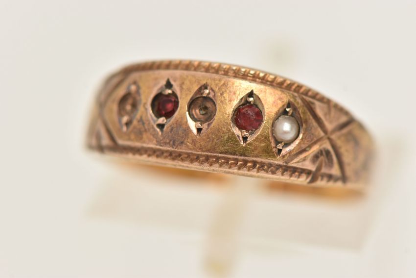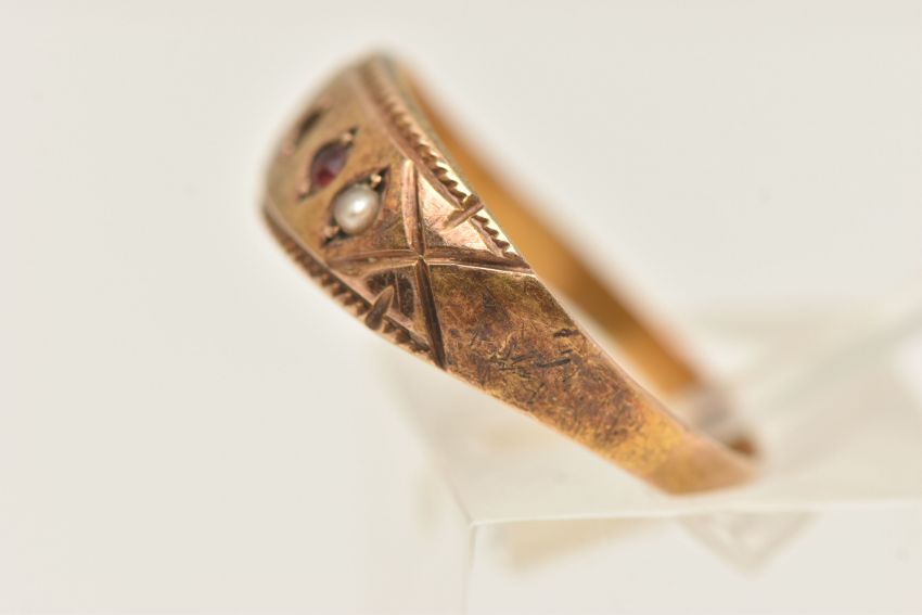 A 15CT GOLD GEM SET RING, set with paste and seed pearls, approximate width 7mm, hallmarked 15ct Chester, ring size O, approximate gross weight 1.7 grams, (condition report: general moderate wear, stones missing, overall condition good)