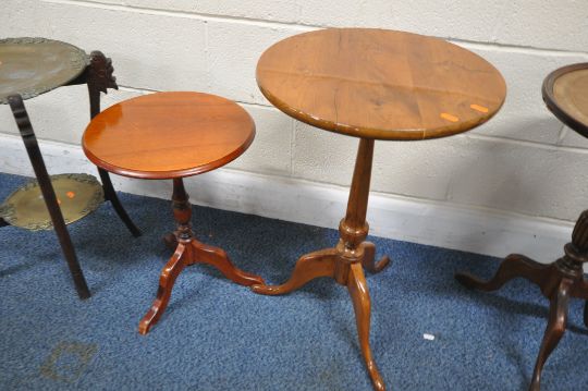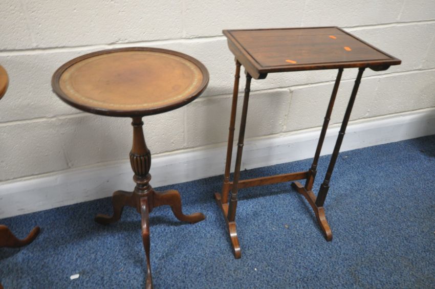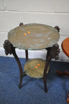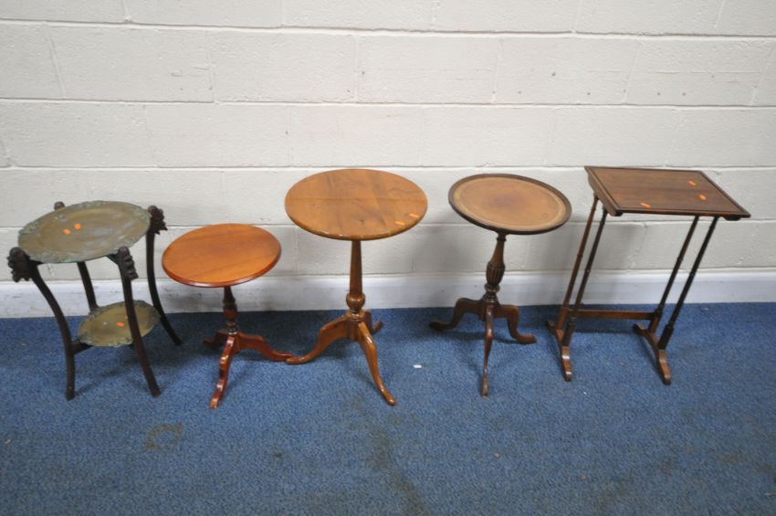 A SELECTION OF OCCASIONAL TABLES, to include a Japanese folding brass, three wine tables, and a rosewood single nest of table, condition report: oxidized brass, rest in overall good condition (5)