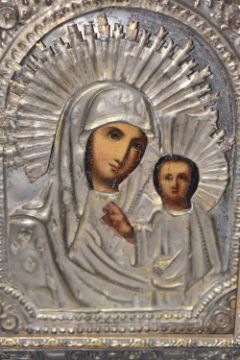 AN ORTHODOX 'MOTHER OF GOD' ICON with fitted oklad mounted in a modern brass frame, height 33cm x width 24.5cm (1) (Condition Report: some wear and repair to the oklad, crazing to the ikon, back unchecked as sealed)