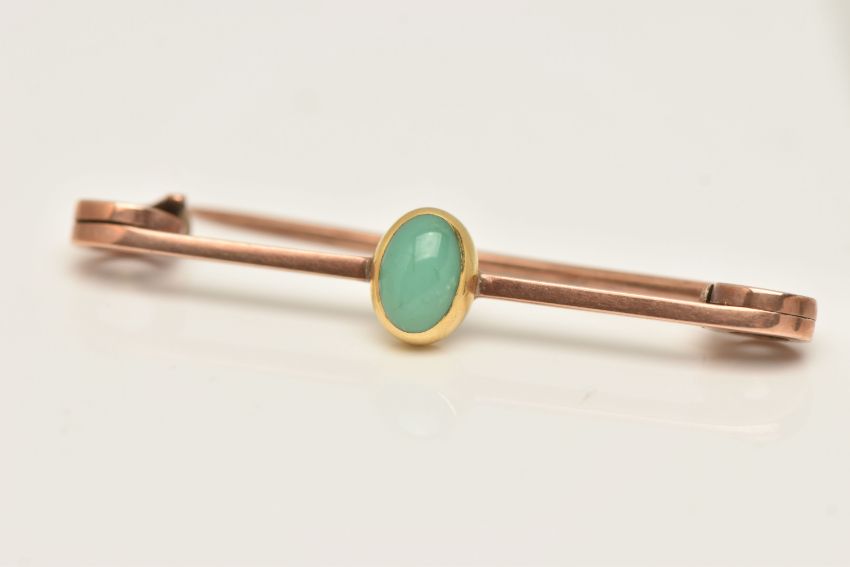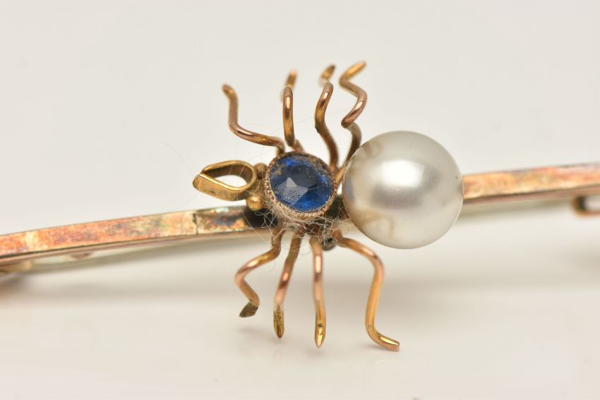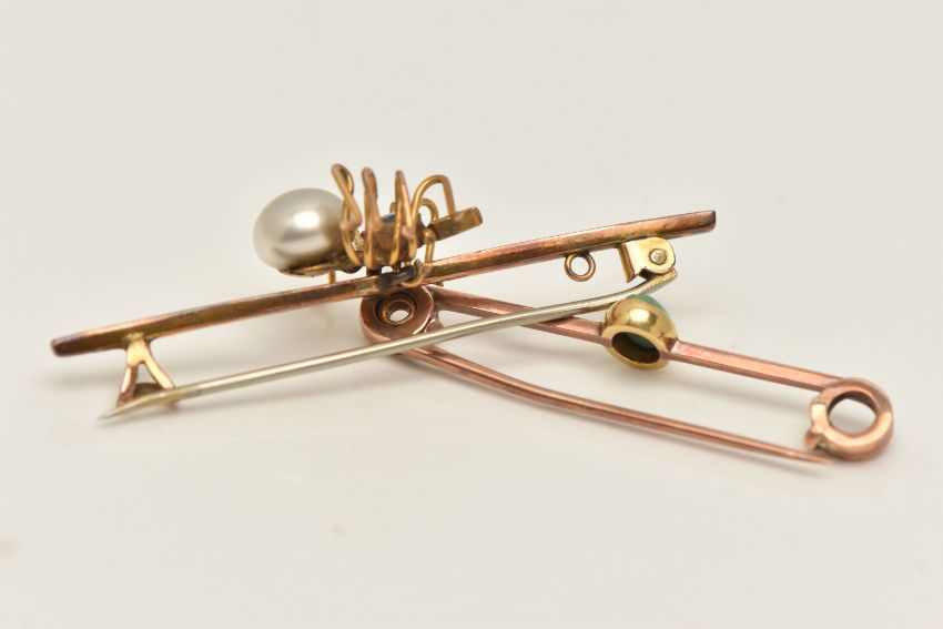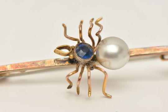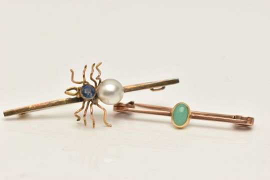TWO BROOCHES, the first a yellow metal bar brooch attached with a spider set with a blue sapphire and a cultured pearl body, brooch stamped 9ct, fitted with a base metal pin, length 54mm, approximate gross weight 2.6 grams, together with a rose metal bar brooch set with a green cabochon stone, unmarked metal, length 42mm, approximate gross weight 2.8 grams (condition report: general light wear, the spider brooch would benefit from a gentle clean)