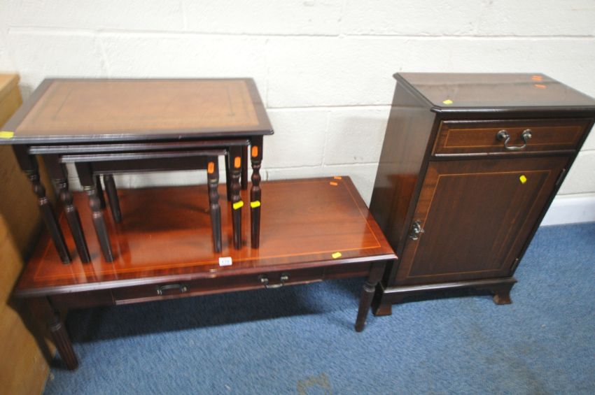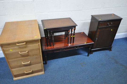 A HOME BUILT OAK FOUR DRAWER CHEST, along with a mahogany coffee table, nest of three tables and a single door cabinet, Condition report: worn finish to filing cabinet (4)