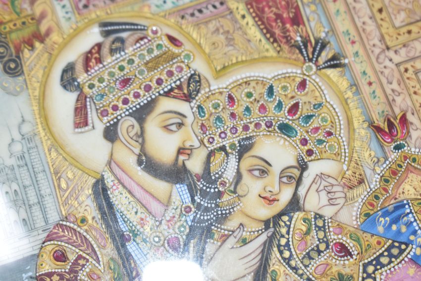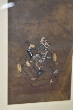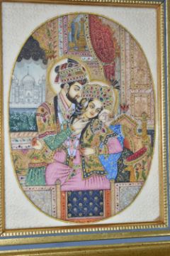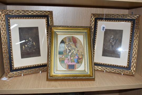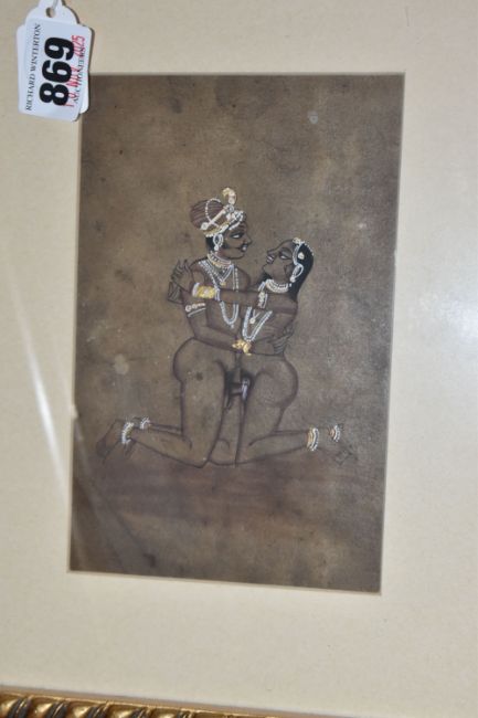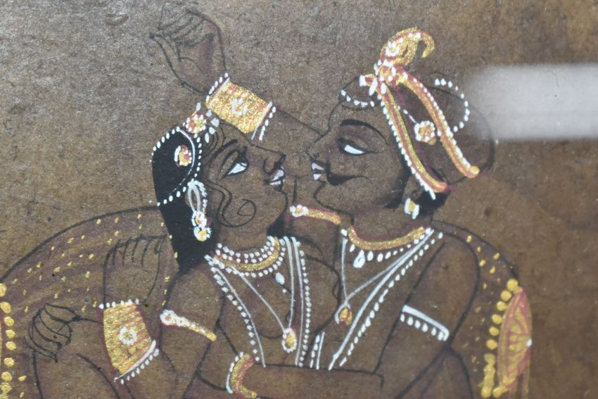 THREE INDO-PERSIAN STYLE EROTIC MINIATURES comprising two hand drawn images with gilt and white decoration, both with Indic script to the reverse (one handwritten, the other from a typewriter), mounted in modern frames, height 33.5cm x width 28cm, and a framed composite miniature of a courtly couple in a modern Mughal style height 30cm x width 24.5cm (3) (Condition Report: the two sketched miniatures have glass to both sides of the frame, one with a crack to the glass on the reverse)