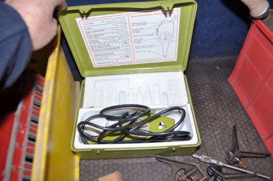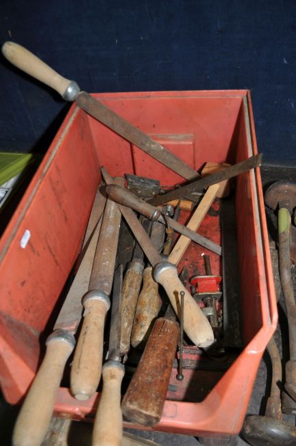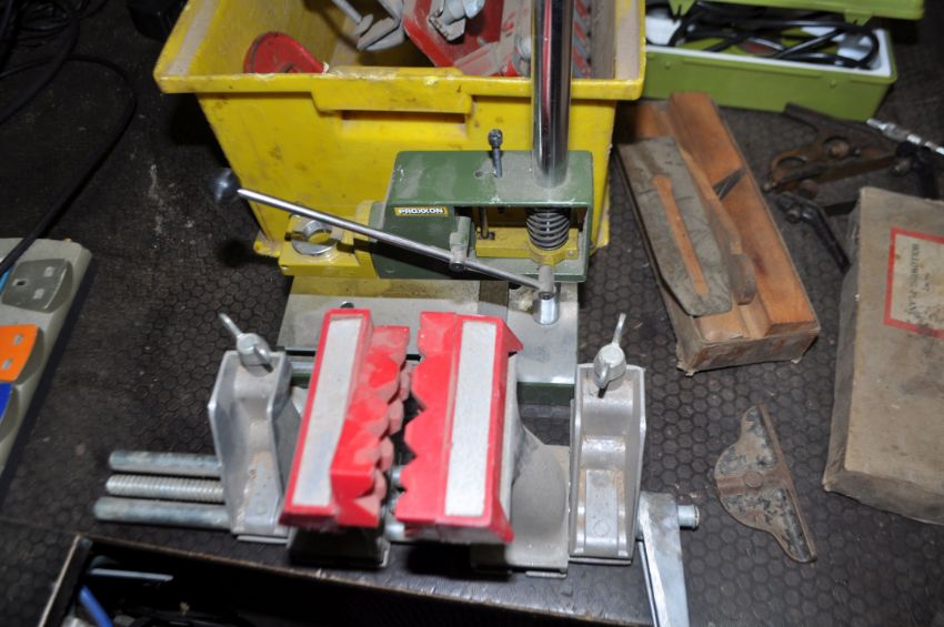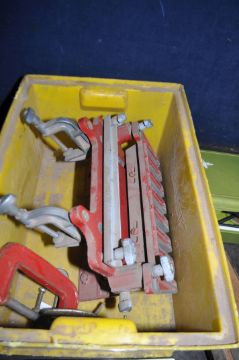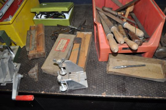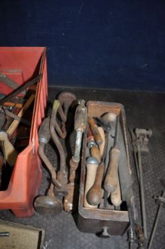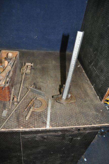TWO TRAYS CONTAINING ENGINEERING TOOLS including a Chesterman height gauge, a marking stand, various combination square parts, three braces, file, a Bosch vice, a Proxxon rotary tool stand, a dovetail jig, etc