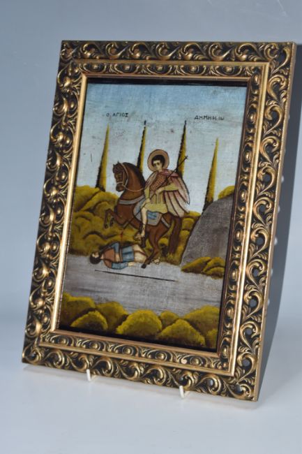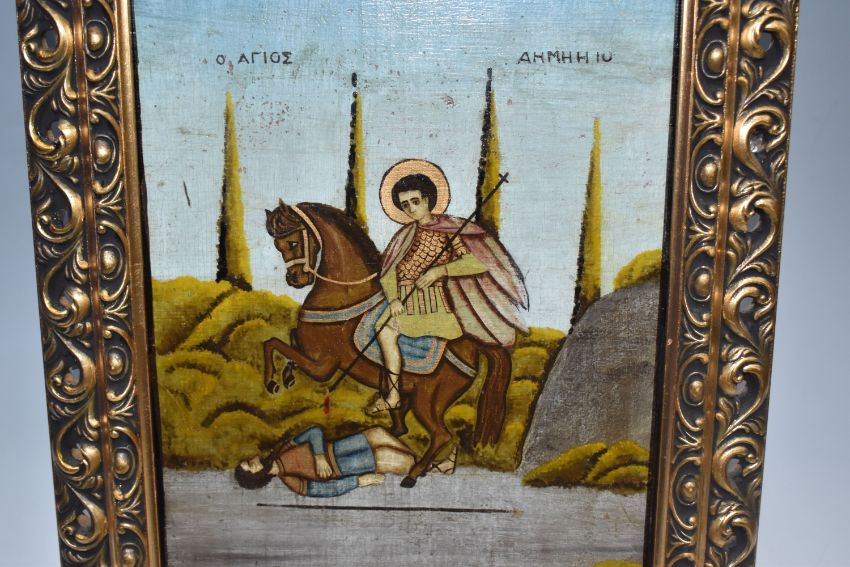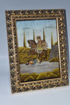 A GREEK ORTHODOX 'ST DEMETRIUS' ICON oil on wood panel in a modern frame, depicting St Demetrius on horseback in a rural scene, height 38cm x width 29cm (1) (Condition Report: some crazing, some chips to the image)