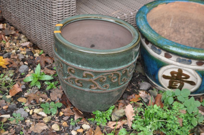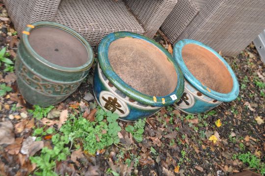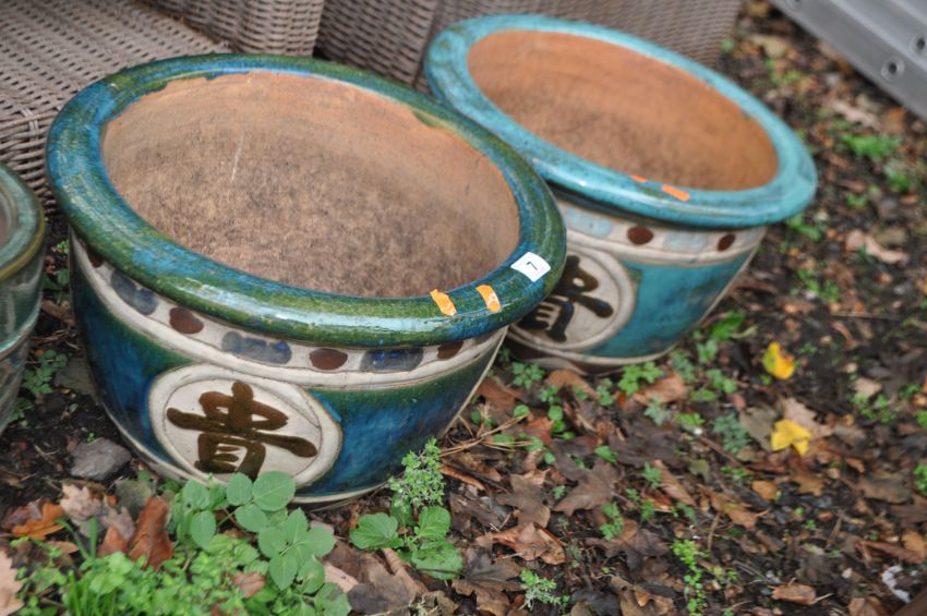 THREE GLAZED GARDEN PLANT POTS including a pair with Chinese characters to bowl, 42cm in diameter (3). Condition Report, no obvious damage