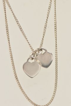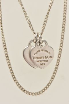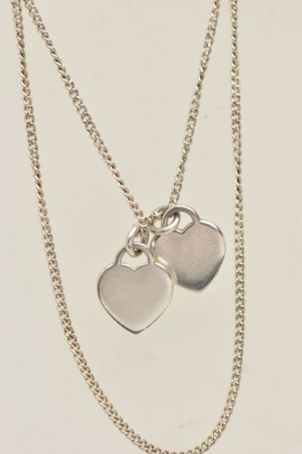 A 'PLEASE RETURN TO TIFFANY & CO NEW YORK' HEART PENDANT WITH A CHAIN, two heart pendants, one signed and stamped 925, the other polished, suspending from a fine curb link chain with spring clasp, stamped 925, length of chain 520mm, approximate gross weight 4.6 grams (condition report: general light wear, chain is not original to the pendant)
